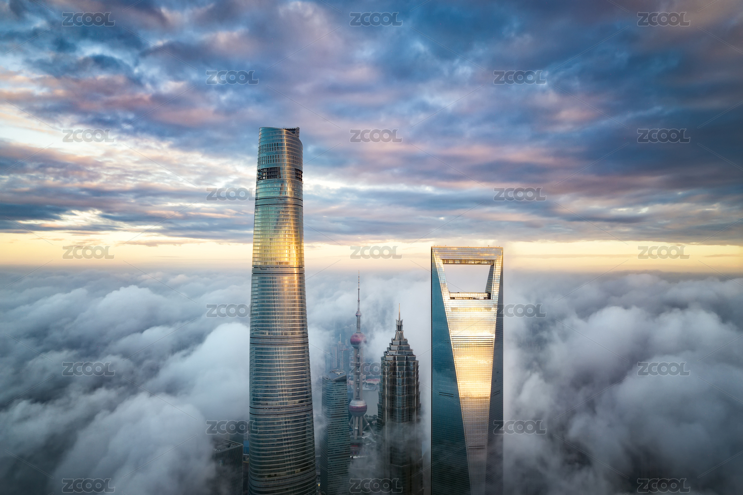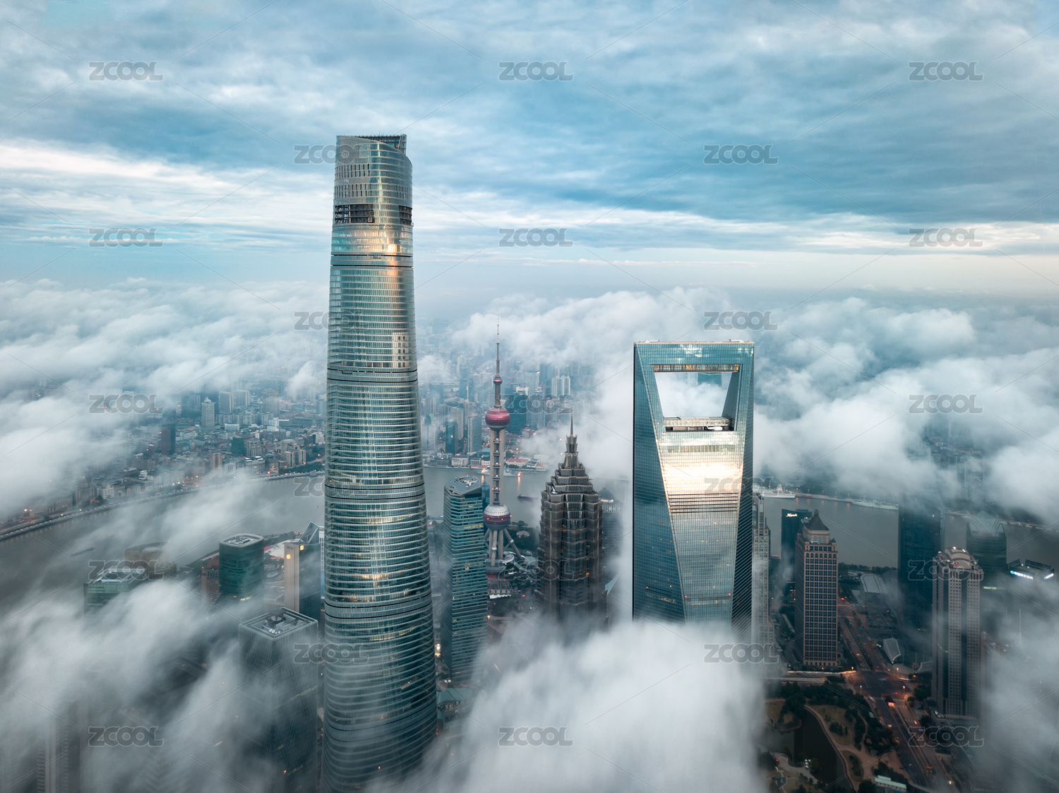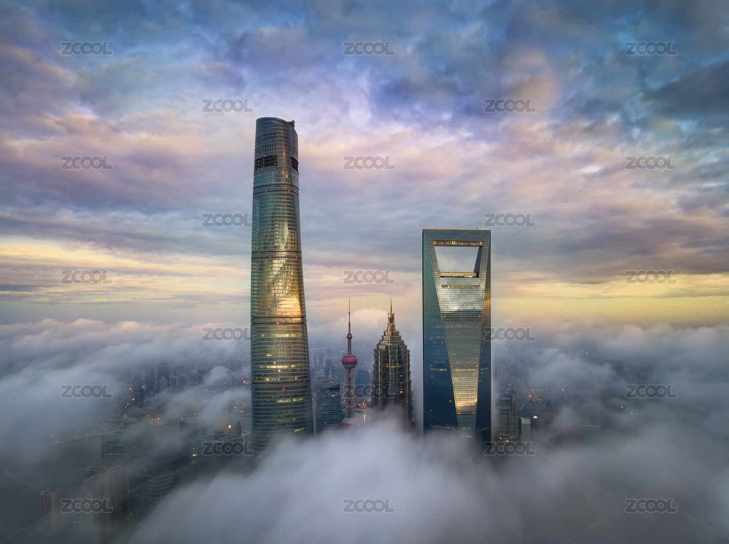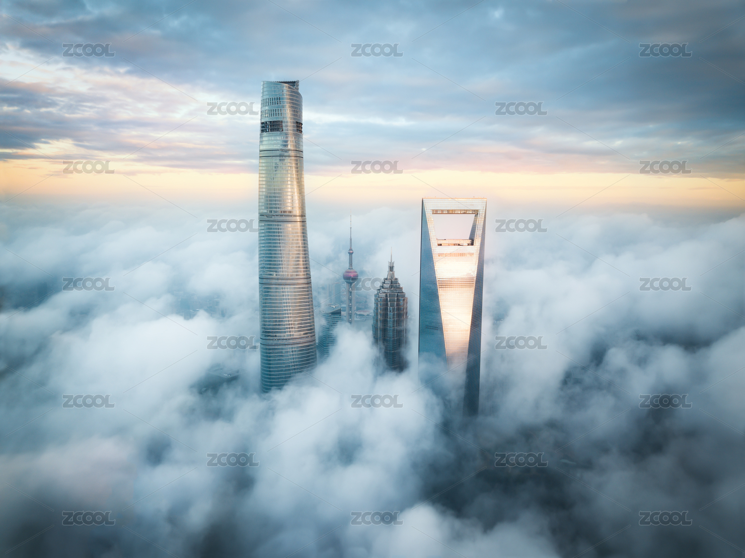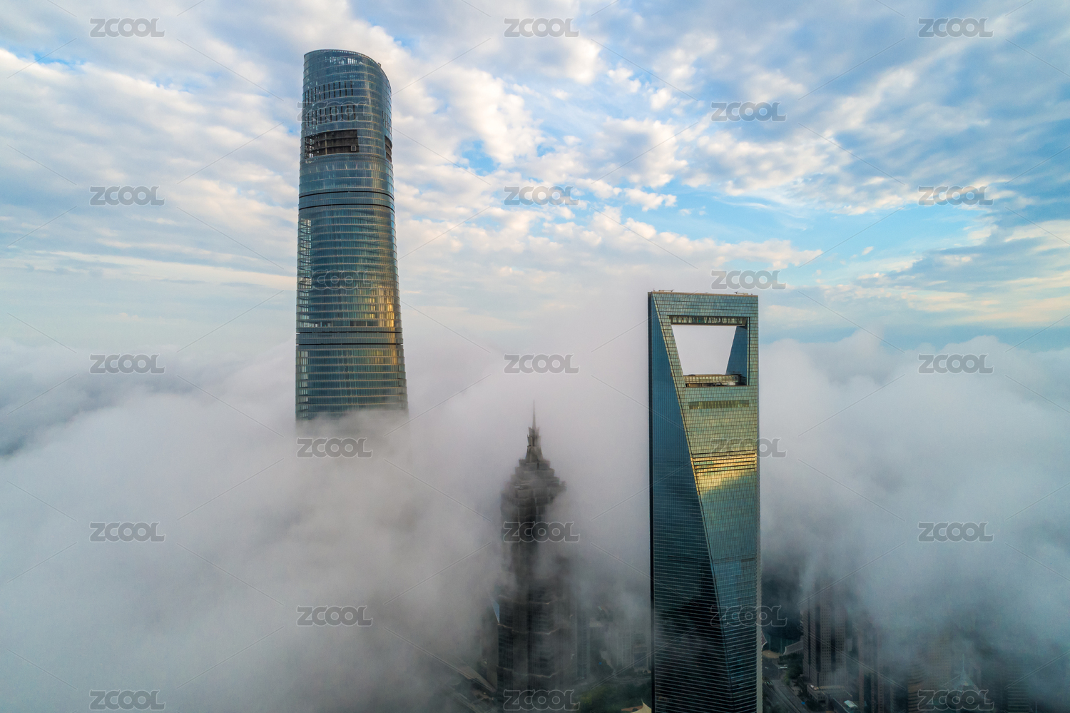 航拍上海外滩陆家嘴城市平流雾建筑风光