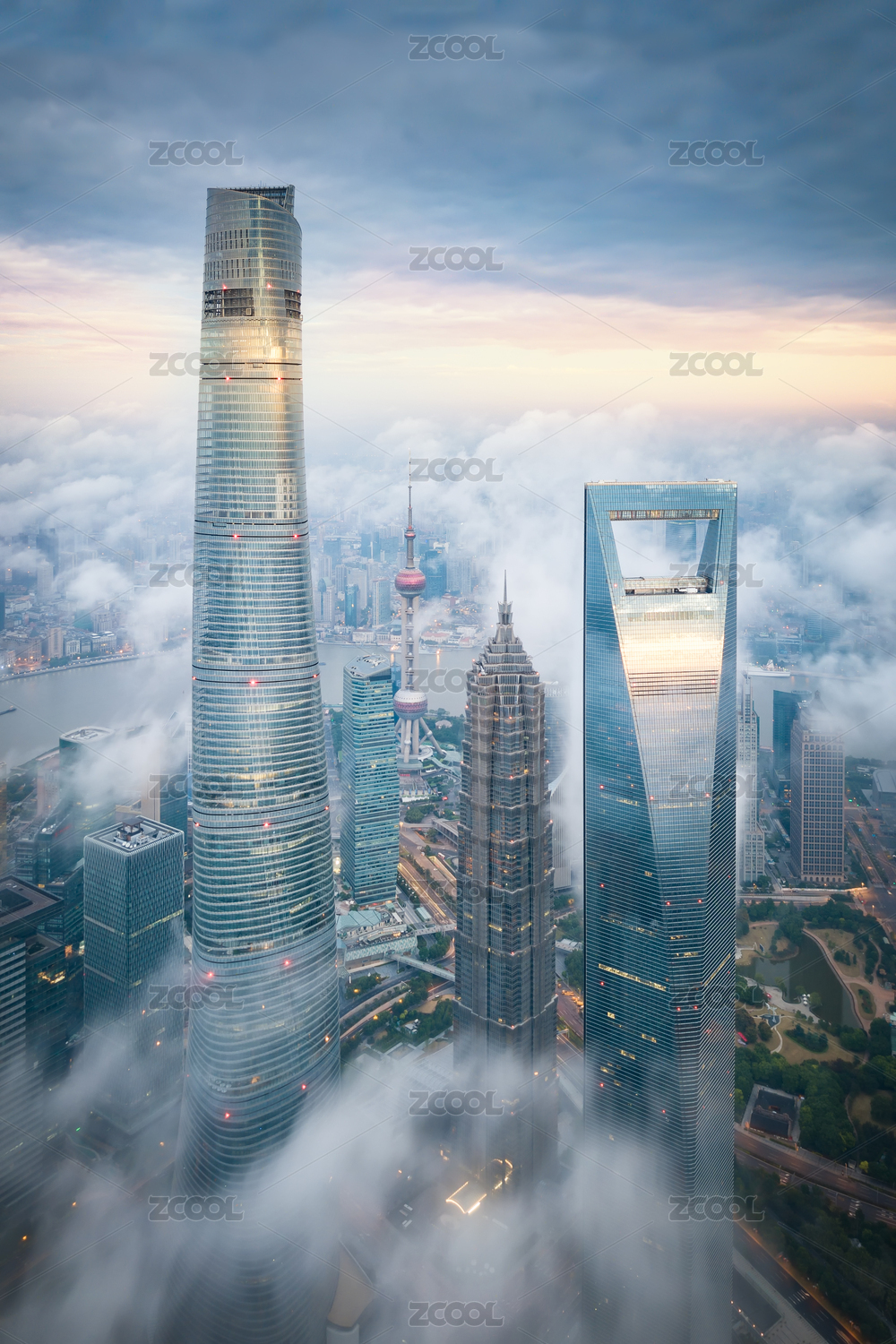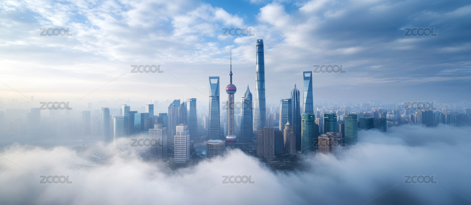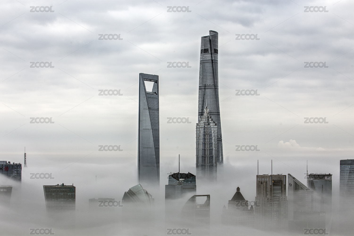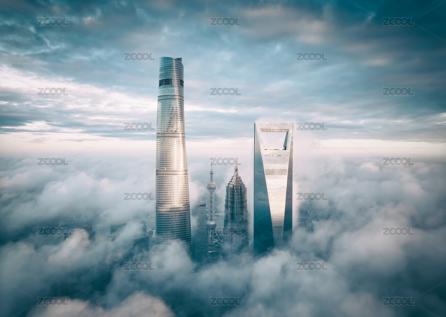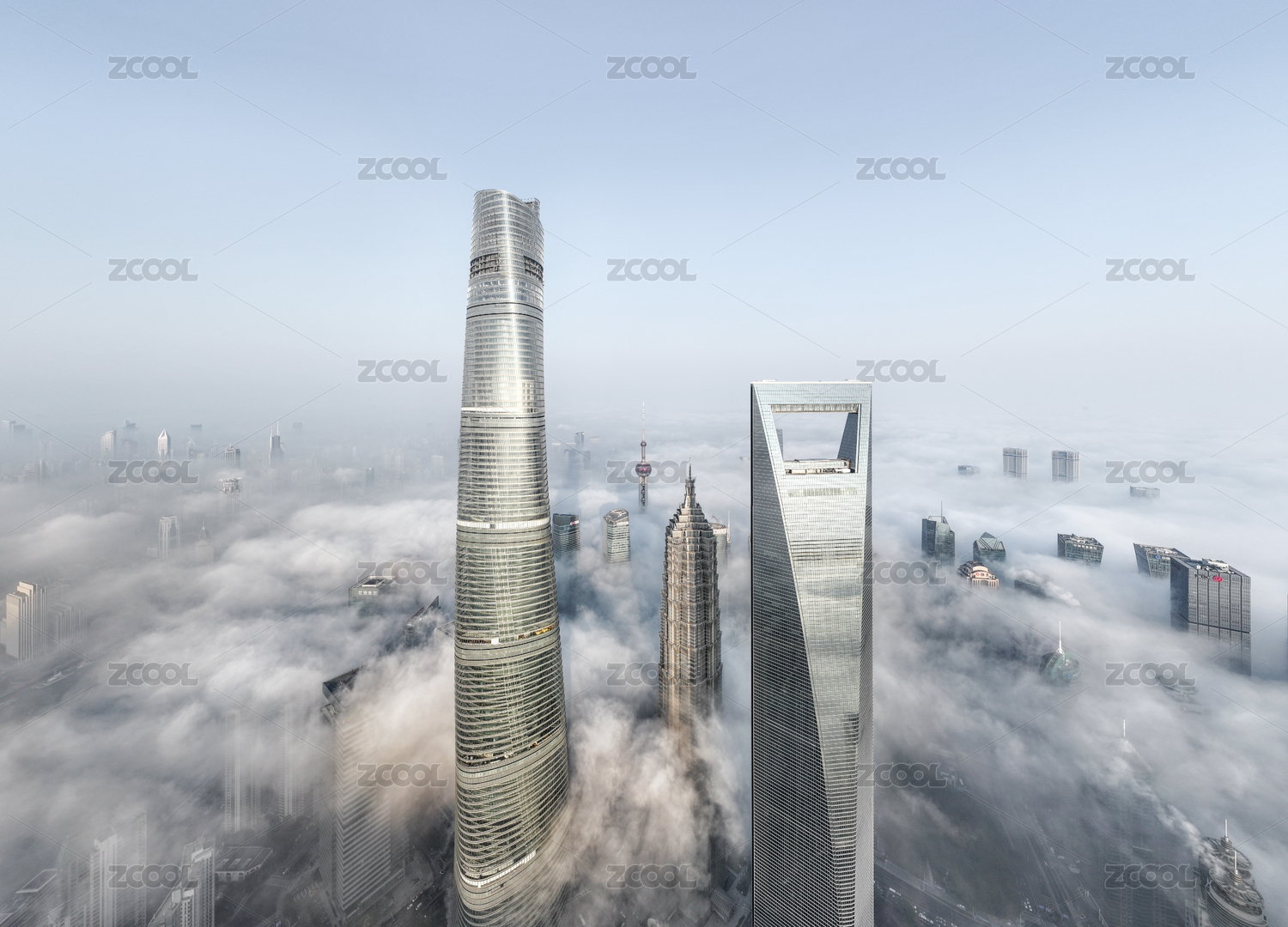 航拍上海外滩陆家嘴城市平流雾建筑风光