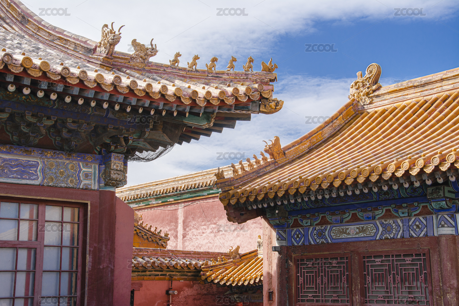 中国北京故宫博物院古建一角——红墙琉璃瓦屋顶、瑞兽