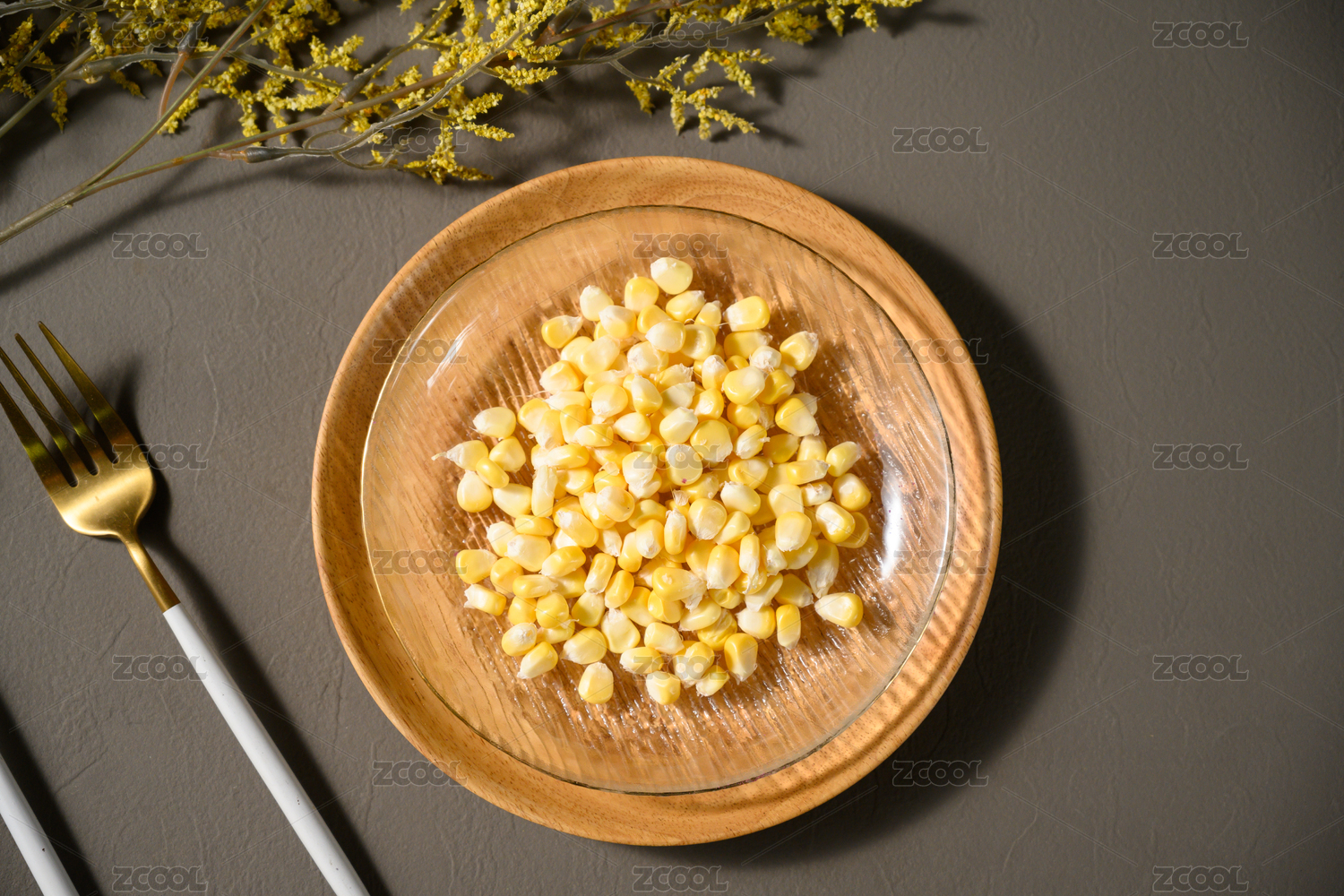 桌面上的盘子里的美味可口的新鲜玉米粒