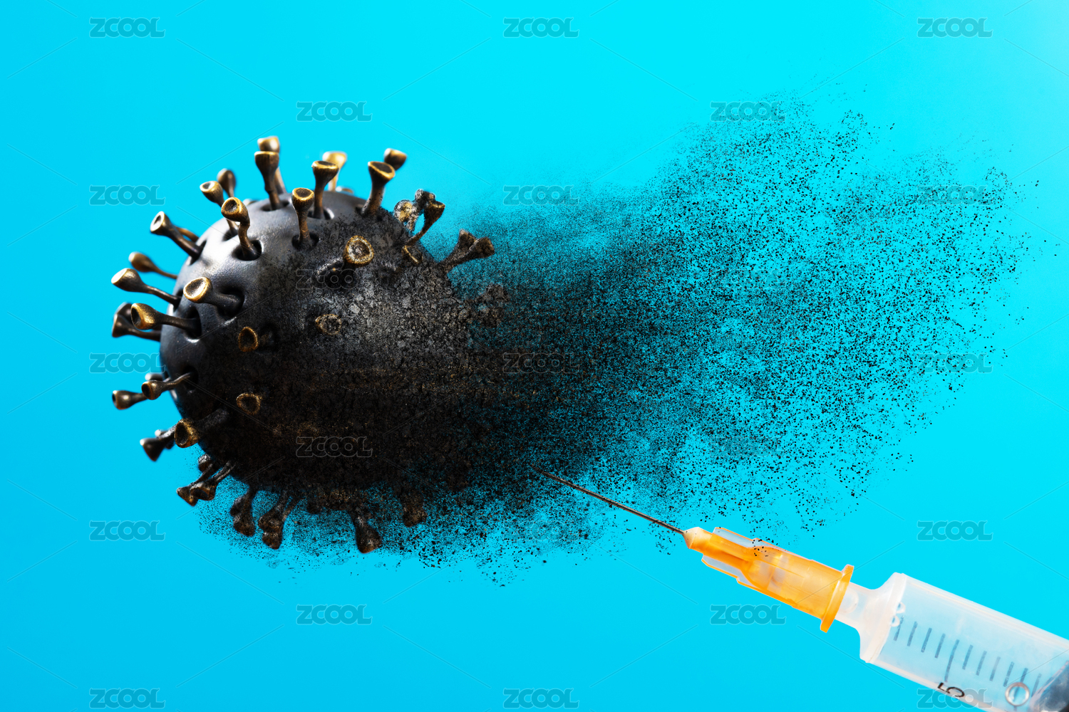 蓝底上的针筒药水及形似病毒的塑料球