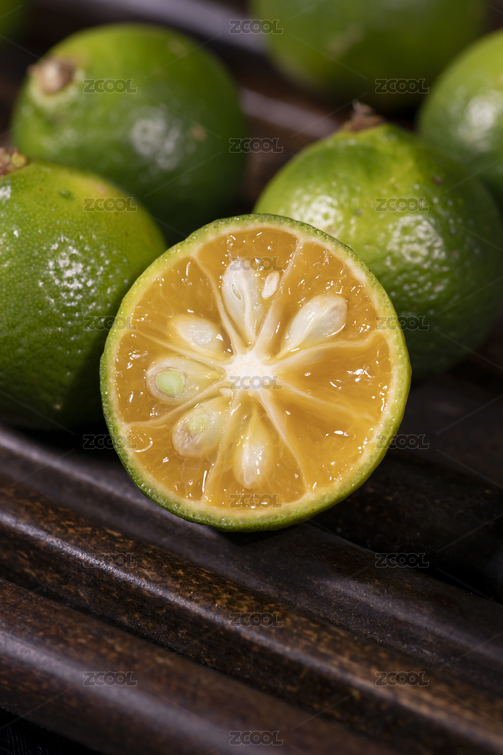 木垫子上放着新鲜海南小金桔和小金桔果肉