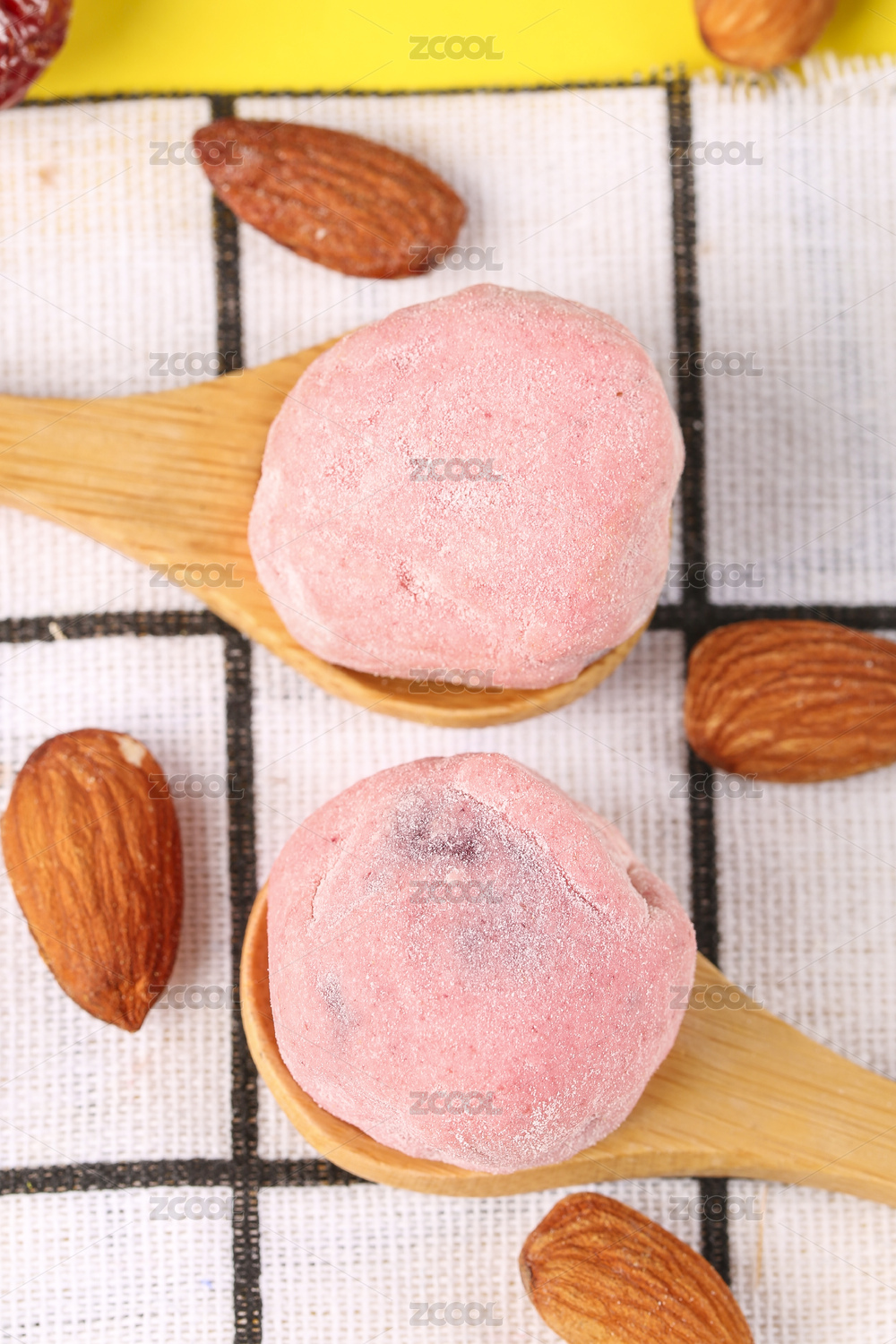 格子底上两个勺子里各放着一个草莓奶酪枣