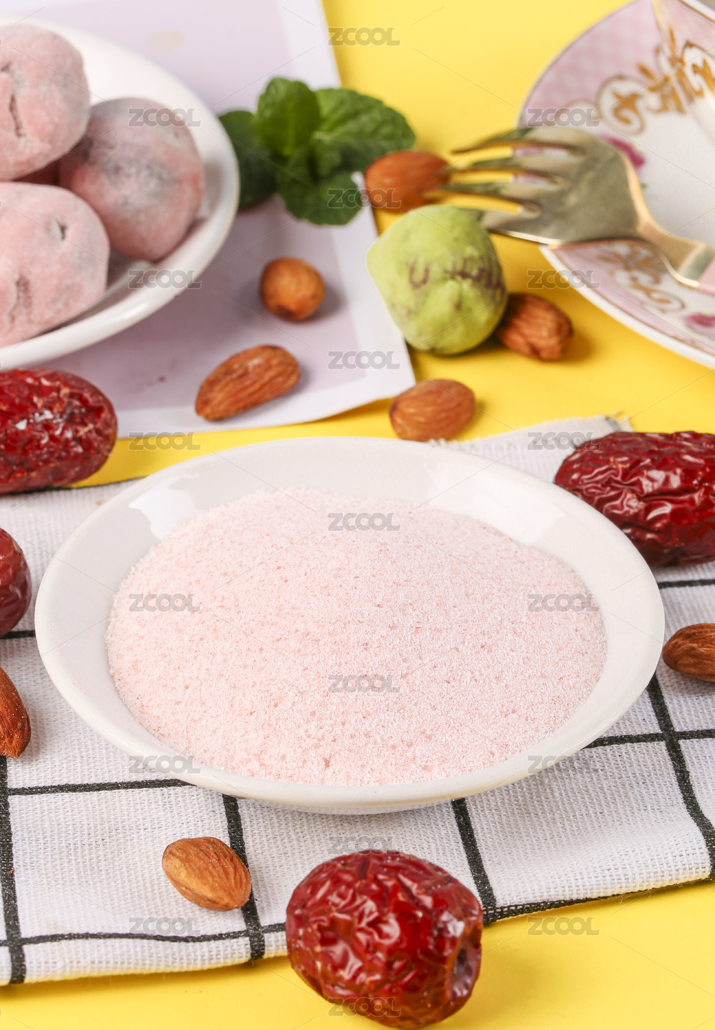 木底上放着一盘草莓粉和勺子上挖着草莓粉