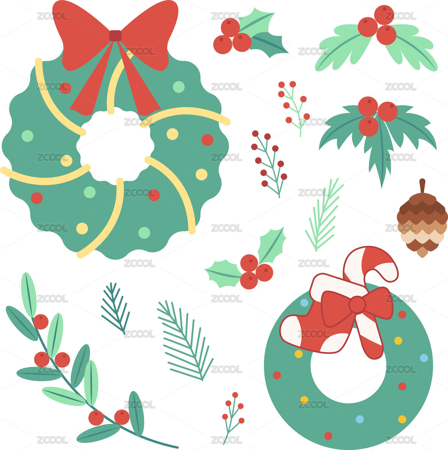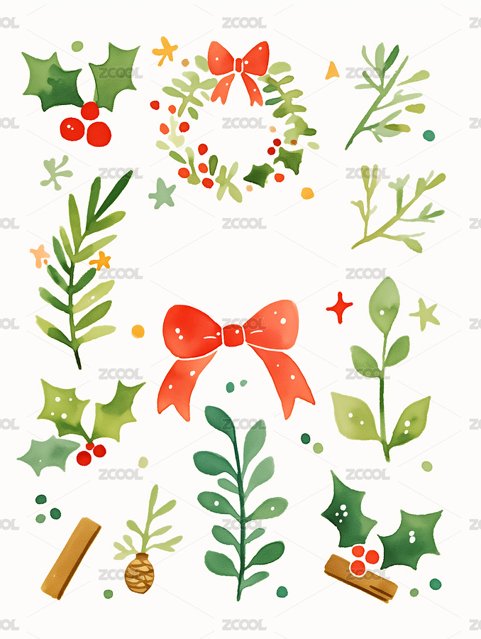 水彩,圣诞节,圣诞装饰,装饰,蝴蝶结,叶子,红果子