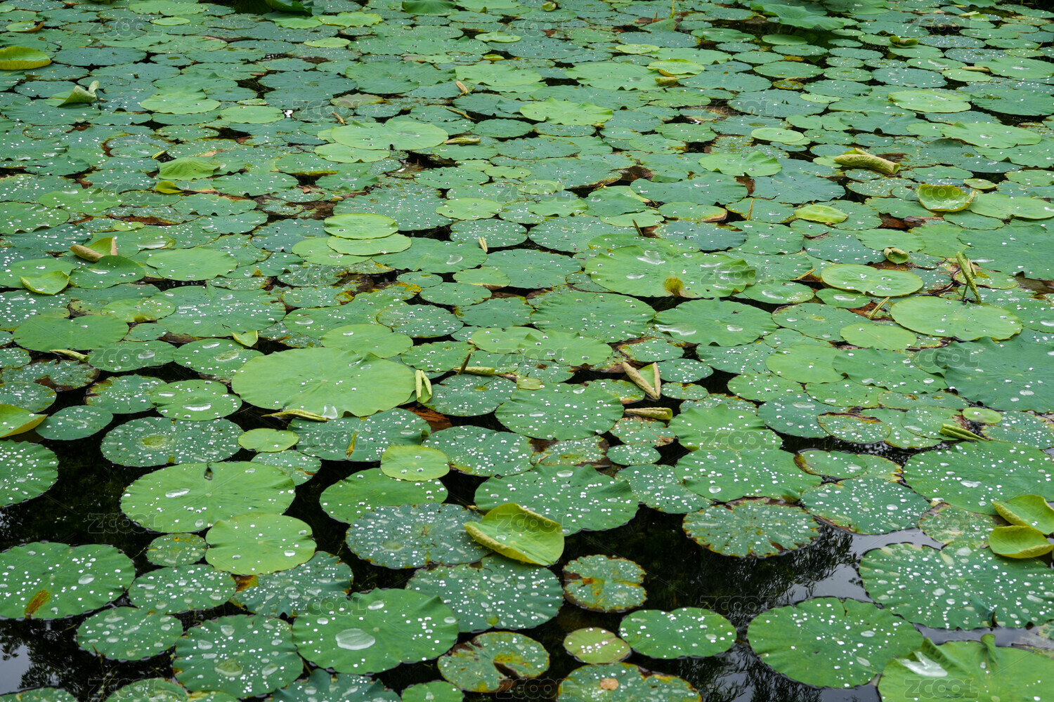 夏天池塘中的绿色荷叶叶子和上面的雨滴水珠