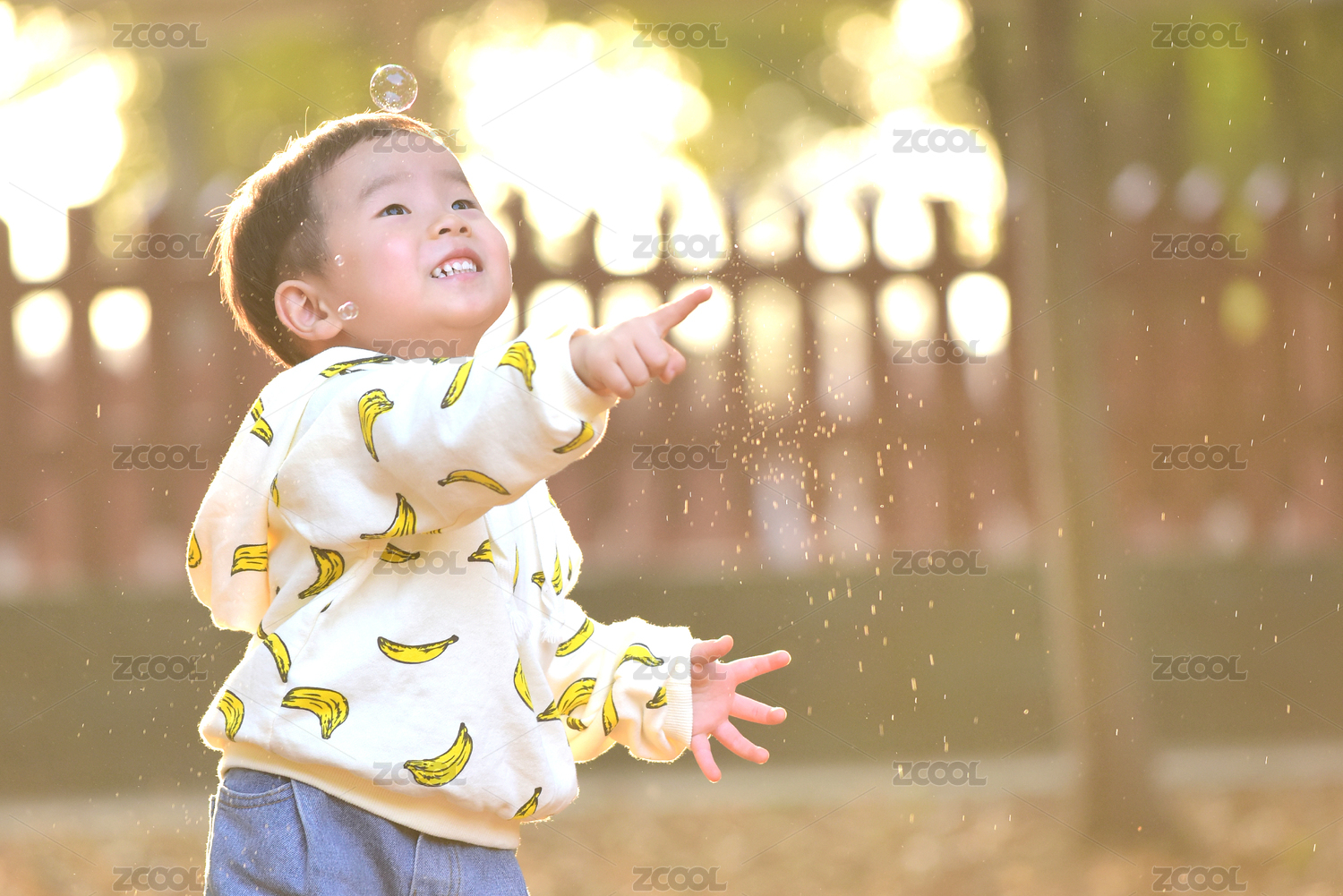 唯美逆光背景下伸手点泡泡的中国小男孩