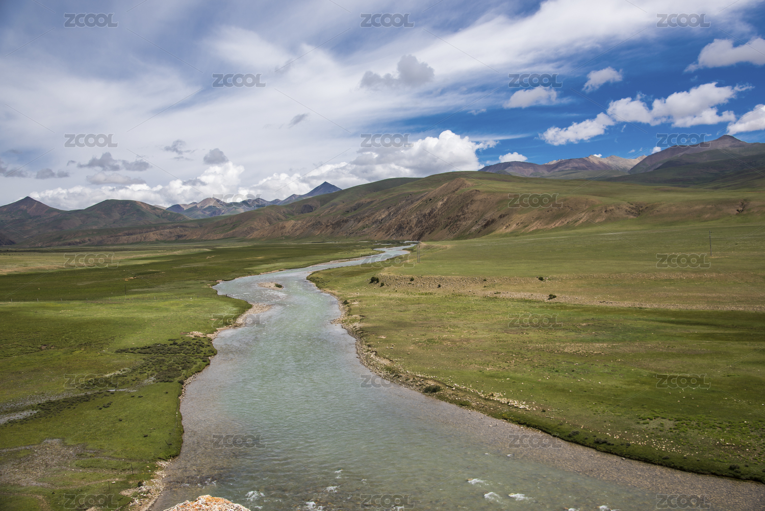 蓝天白云下河流穿过高山草甸
