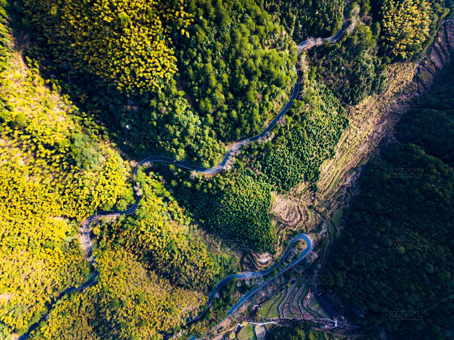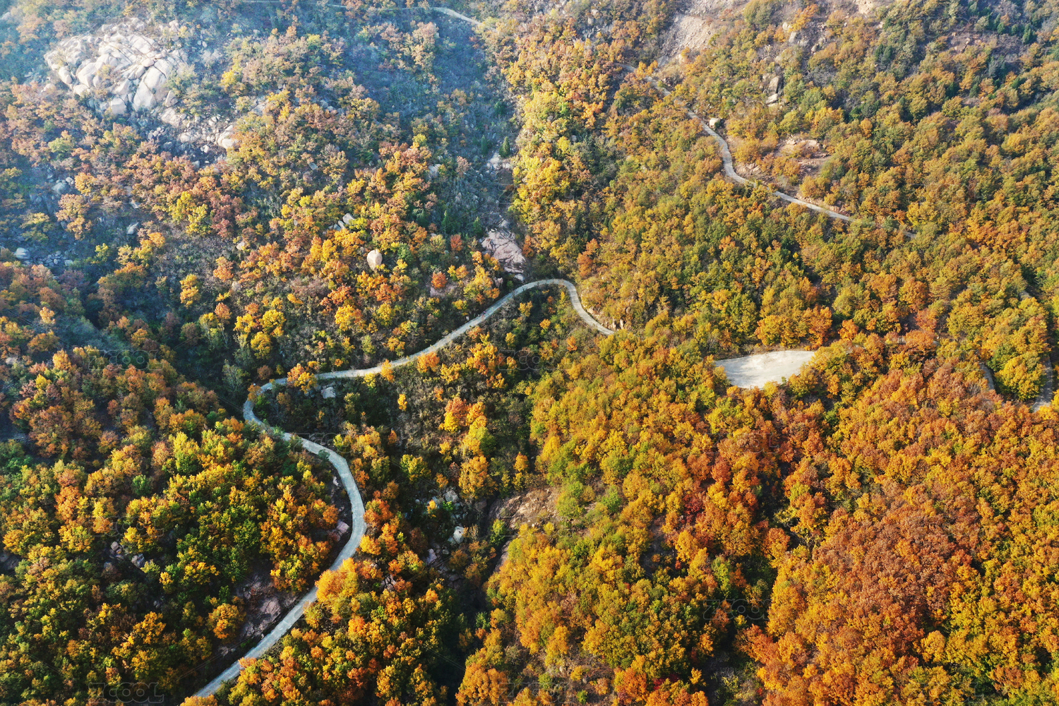 山东枣庄莲青山上一条在秋天多彩树林中穿行的盘山路