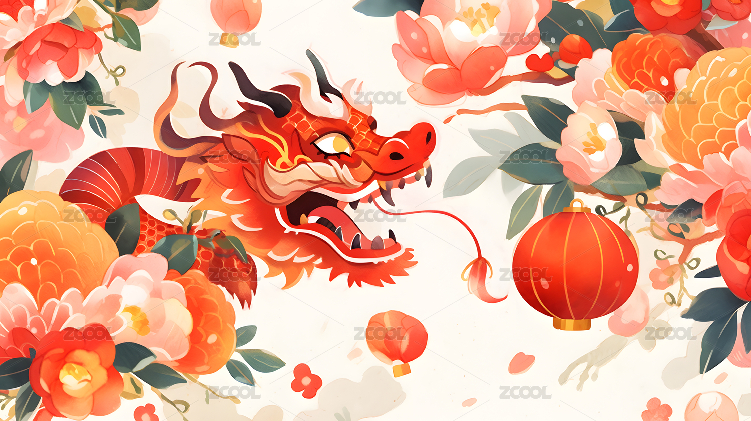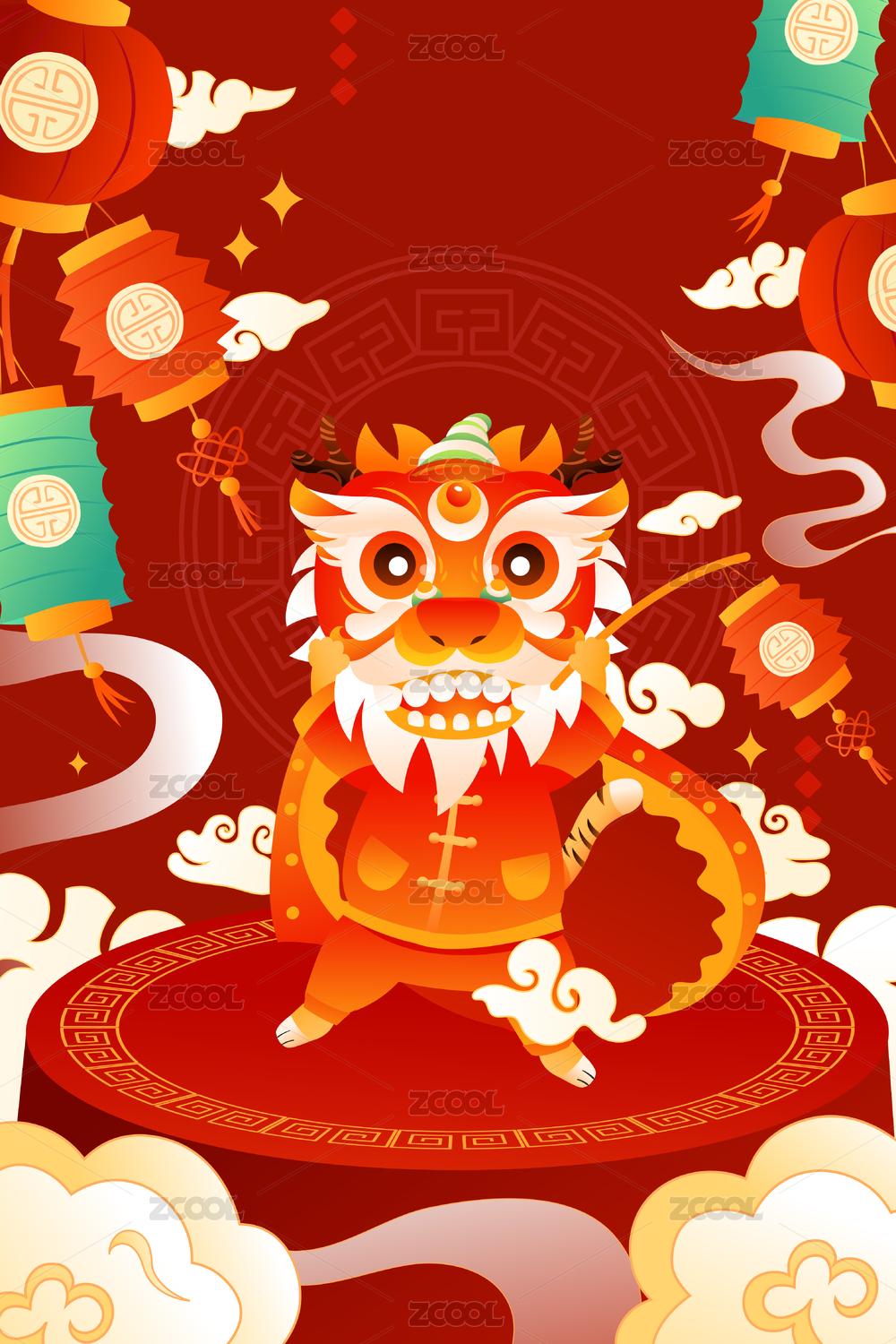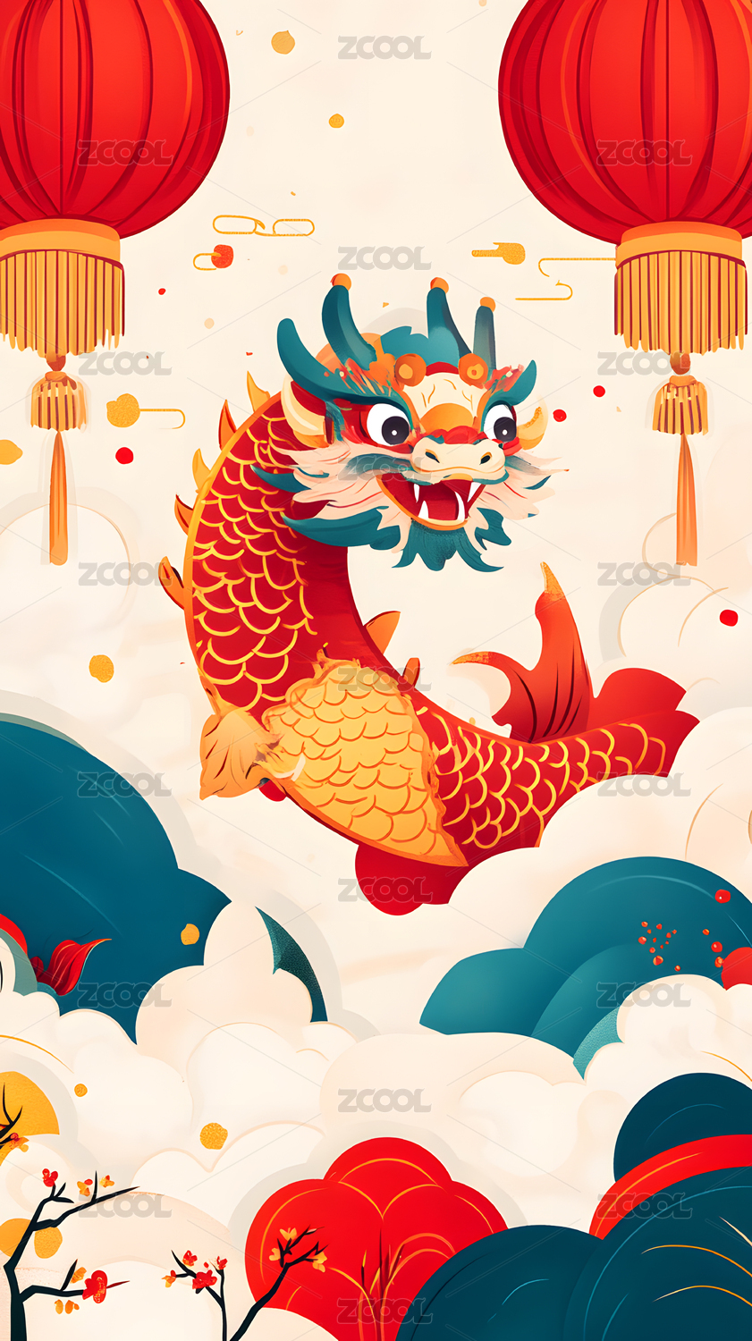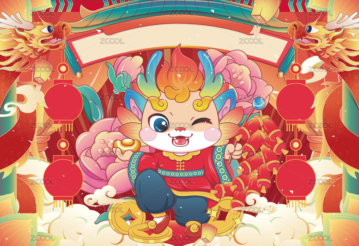 龙年,新年,龙头,龙柱,灯笼,祥云,屋檐,孔明灯,拟人,可爱
