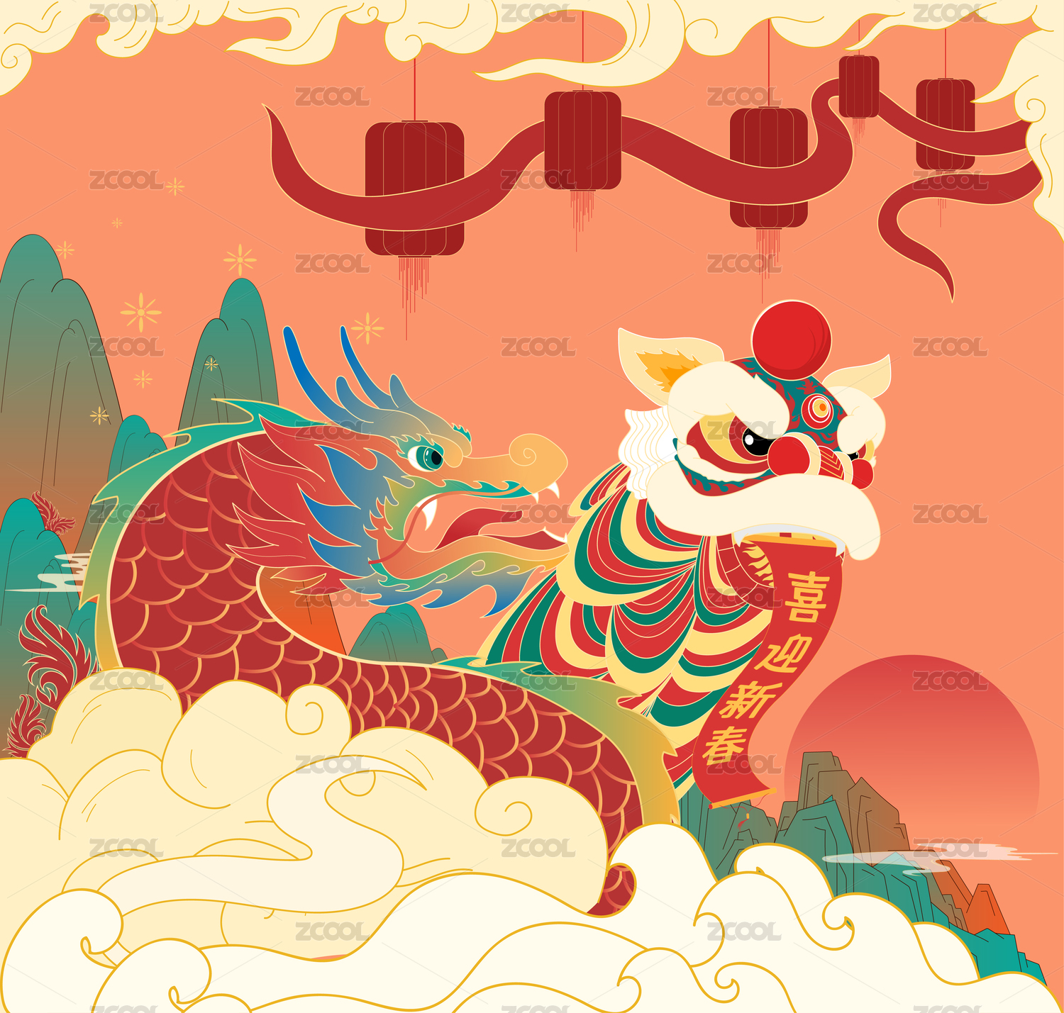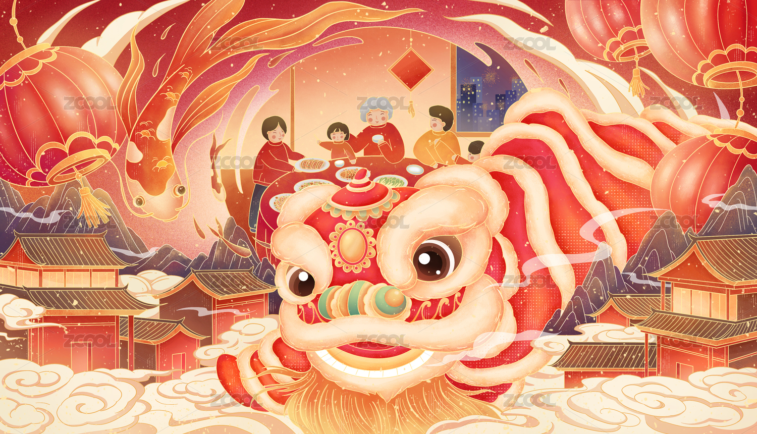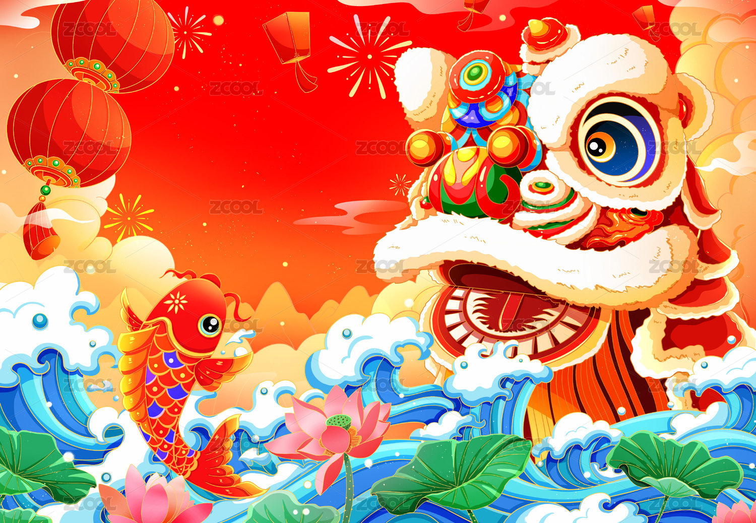 国潮中国新年春节喜庆醒狮贺新年新春插画
