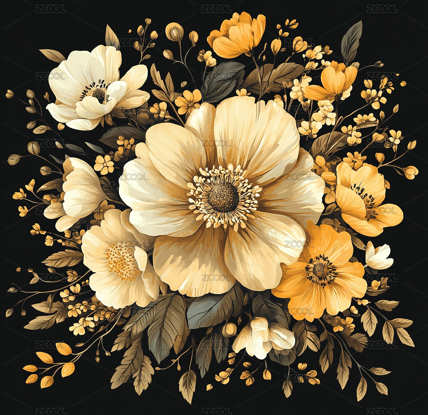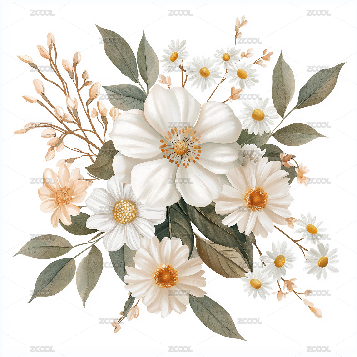 花,清新,AI数字艺术,水彩,画,雏菊,花簇,叶子,植物学,花头