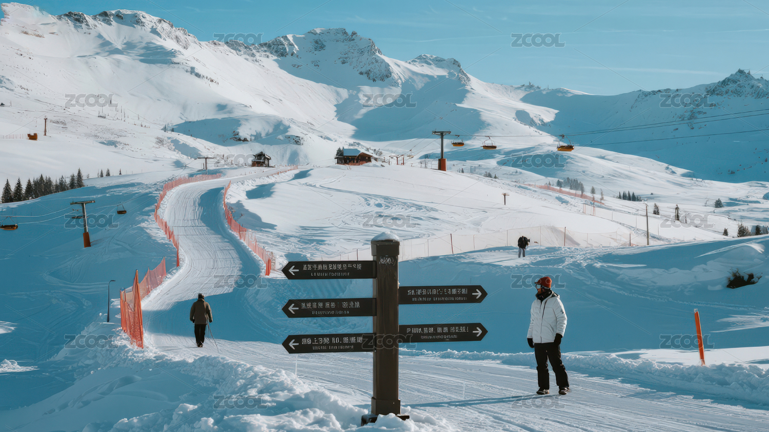 雪山滑雪场指示牌与游客