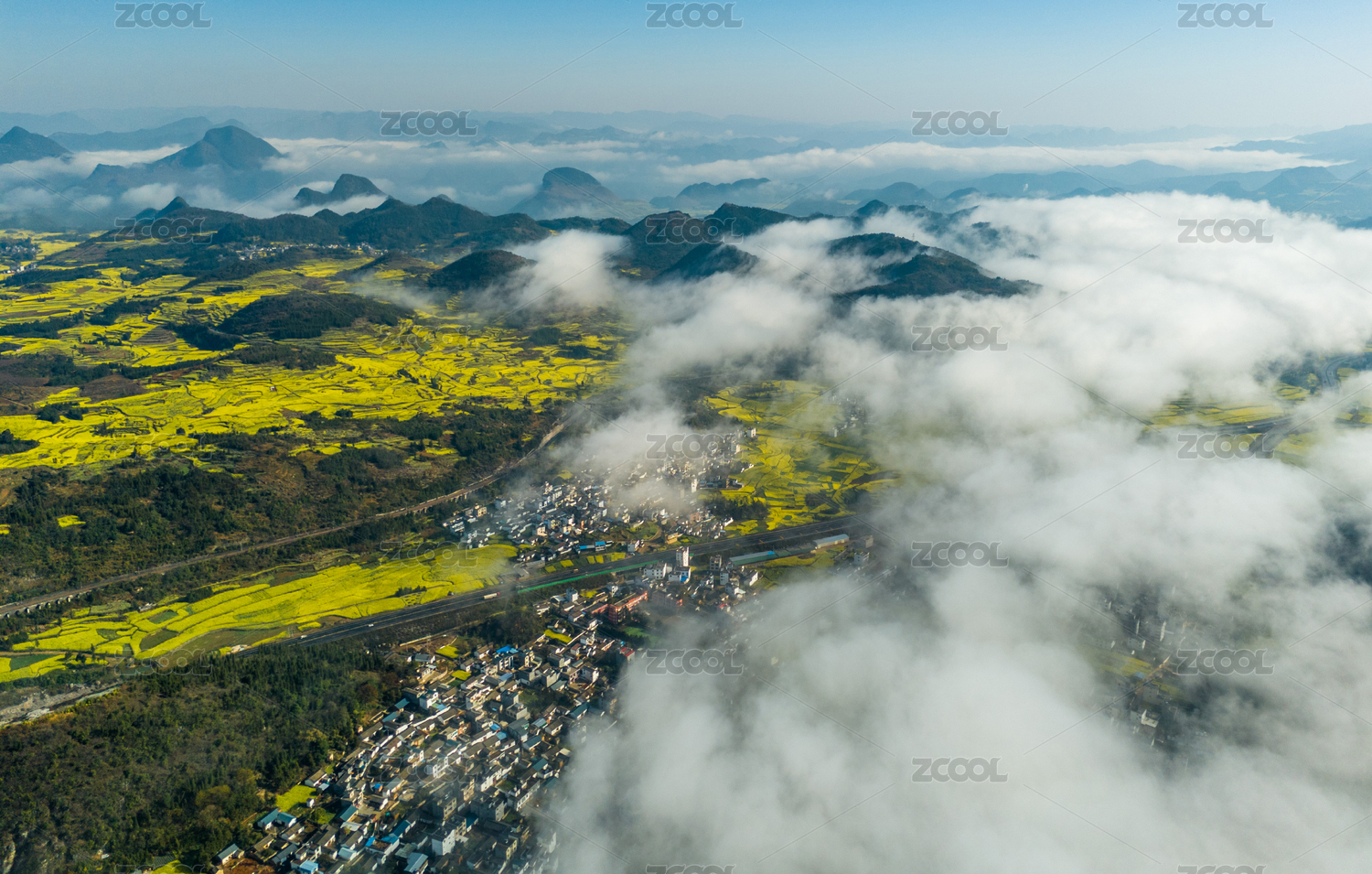 航拍中国安徽黄山歙县石潭春天云海油菜花