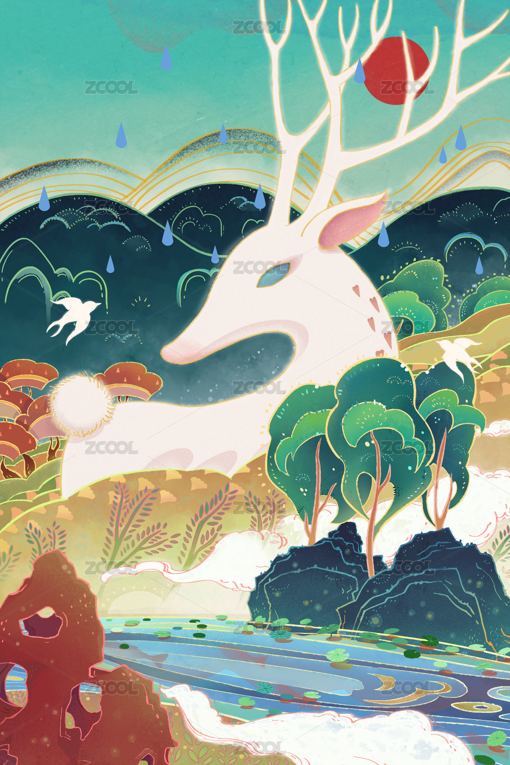 国潮中国风春天森林里的仙鹿插画