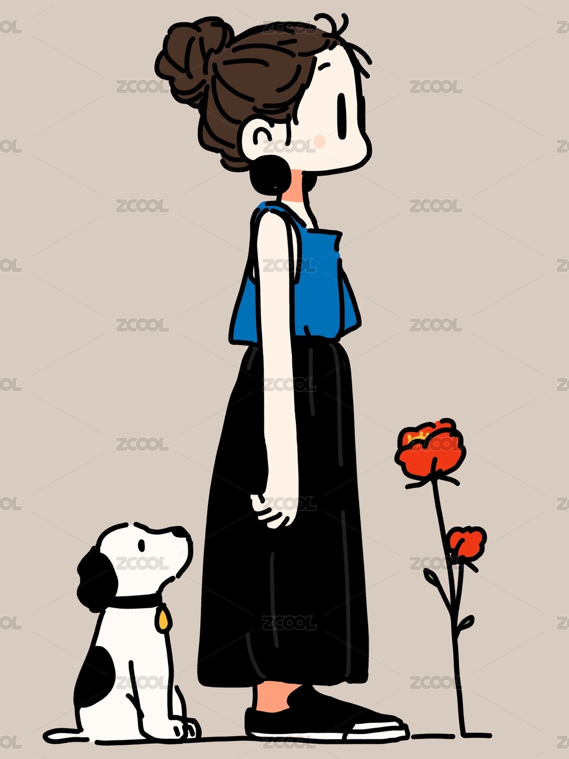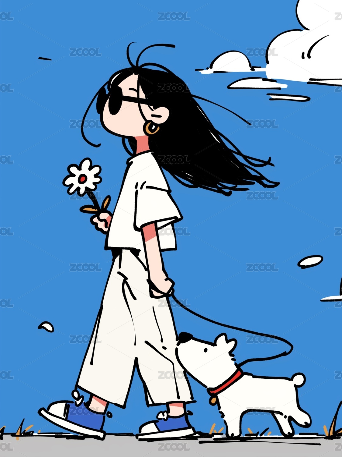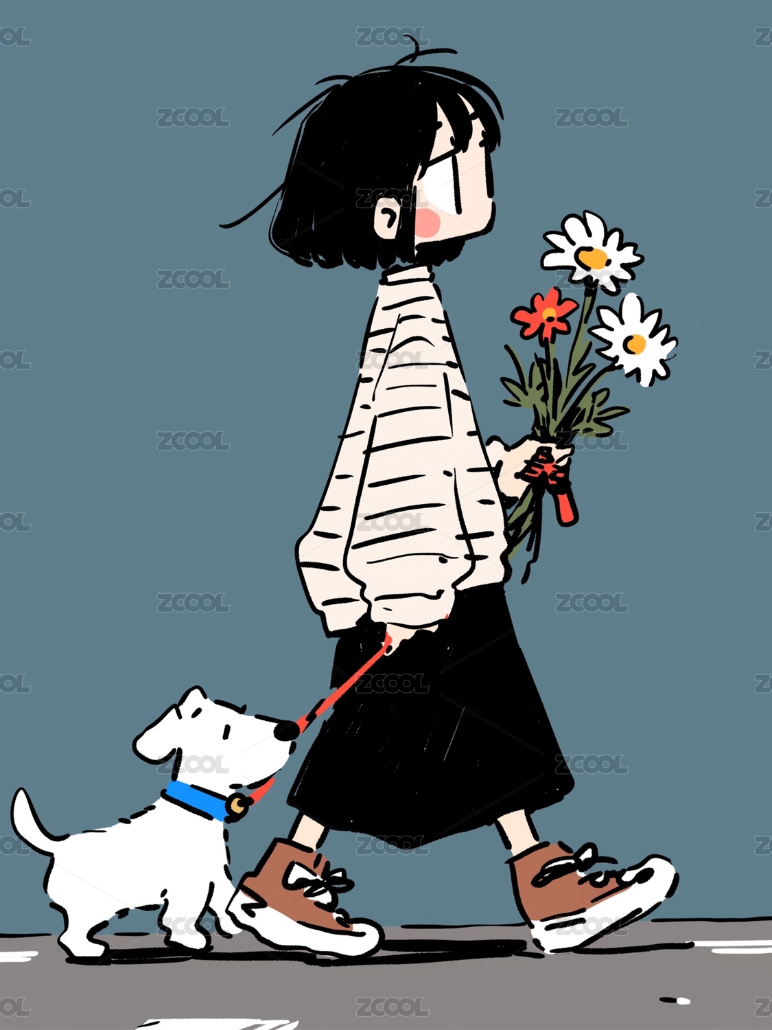 遛狗,鲜花,少女,扁平风,涂鸦风,休闲风