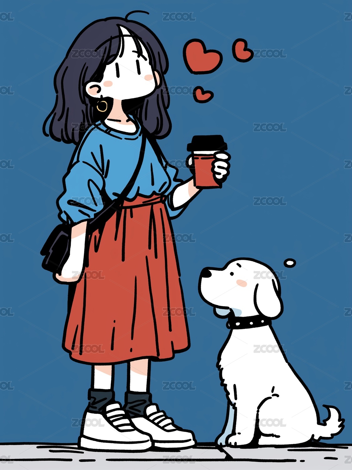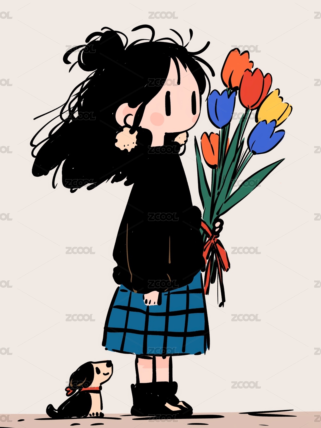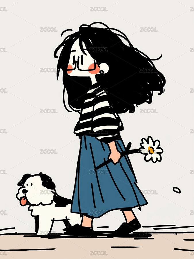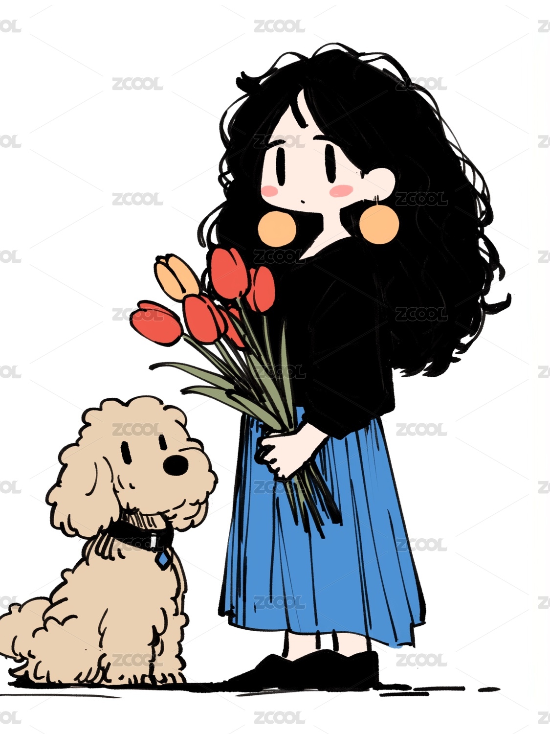遛狗,鲜花,少女,扁平风,涂鸦风,休闲风