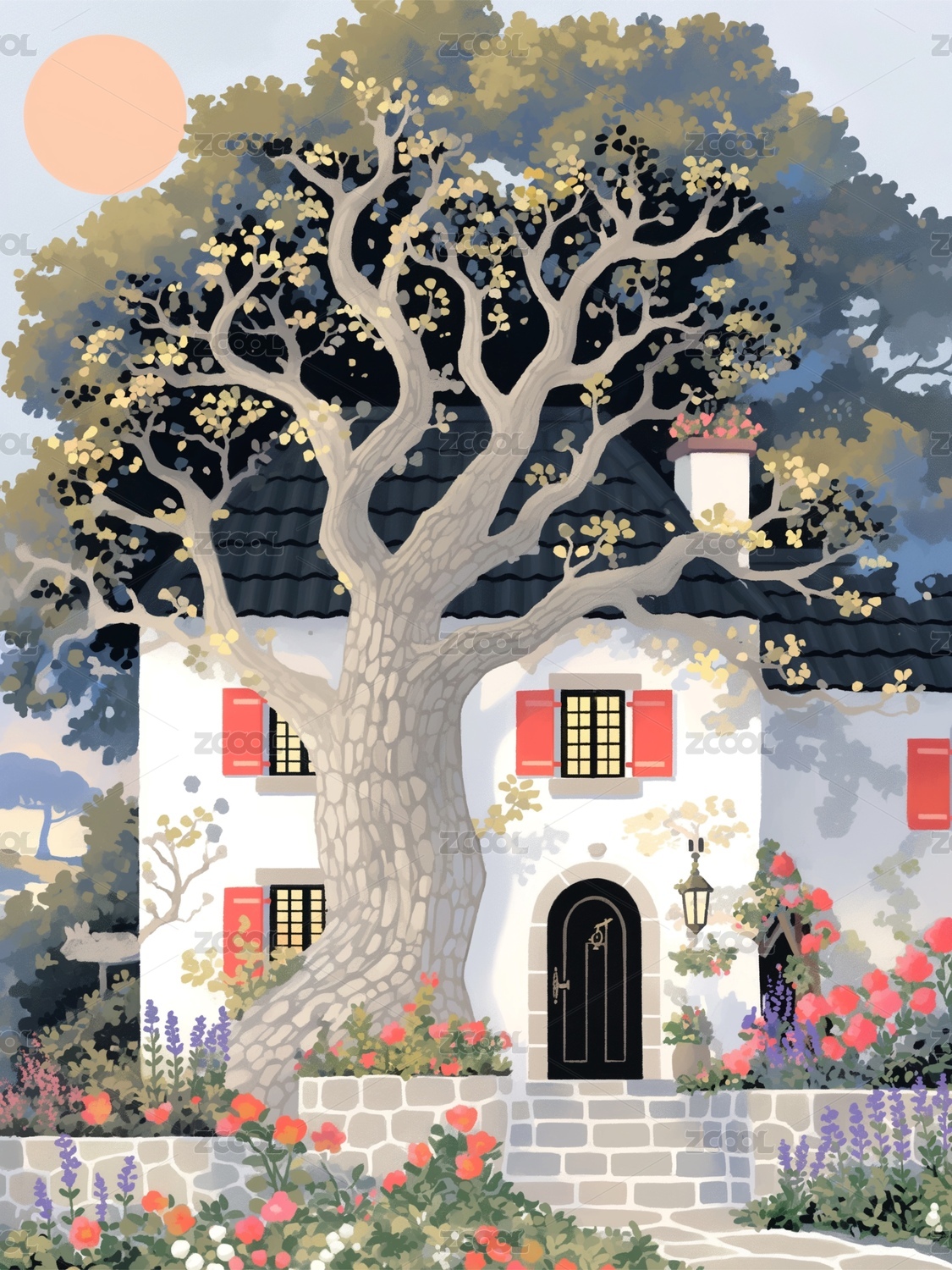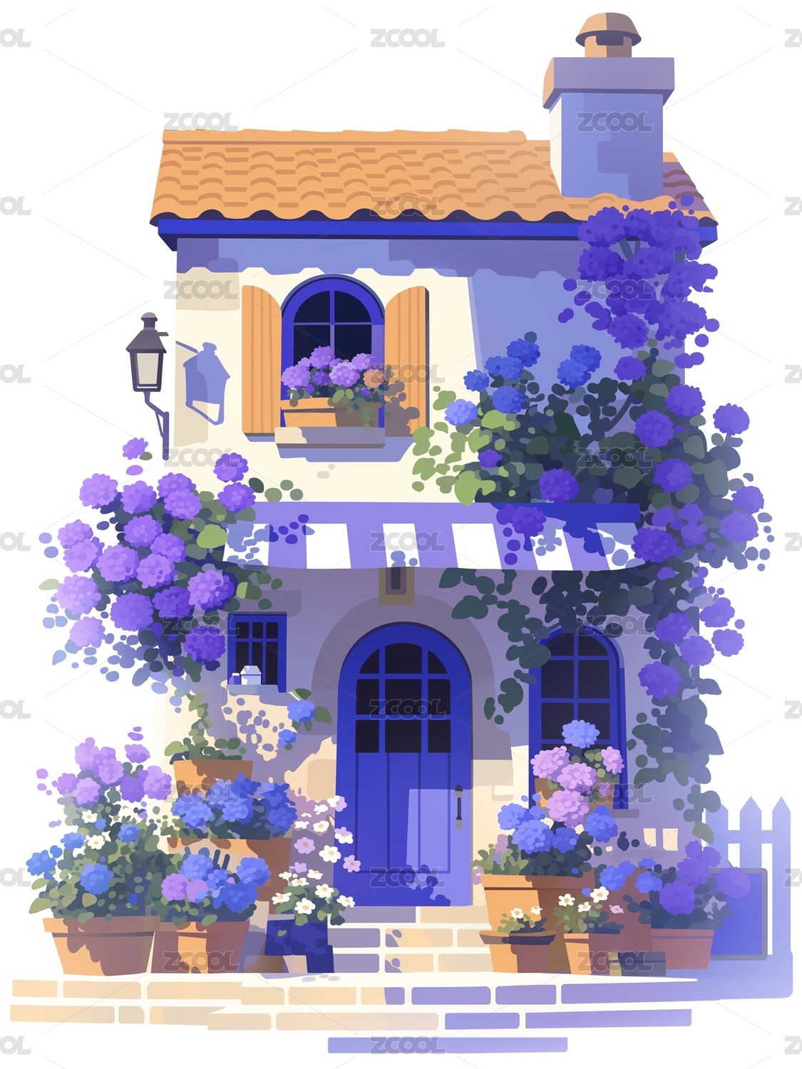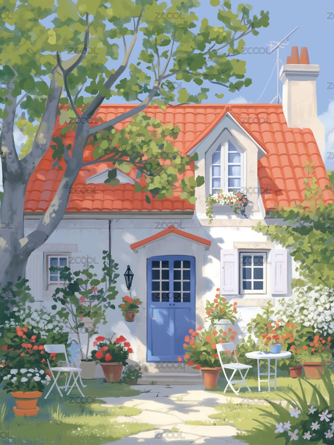 鲜花,房屋,花园,风景画,插画,童话,梦幻