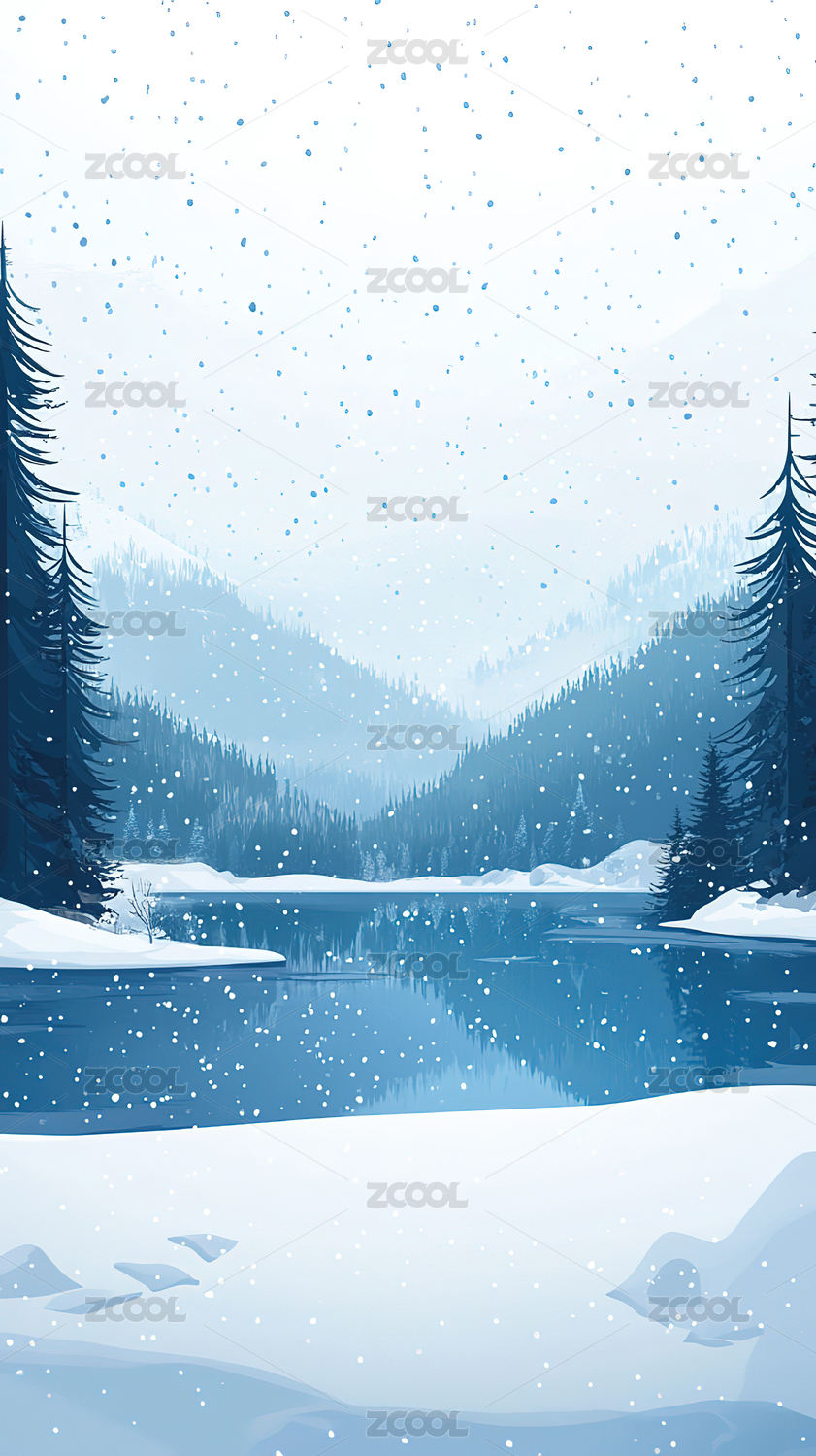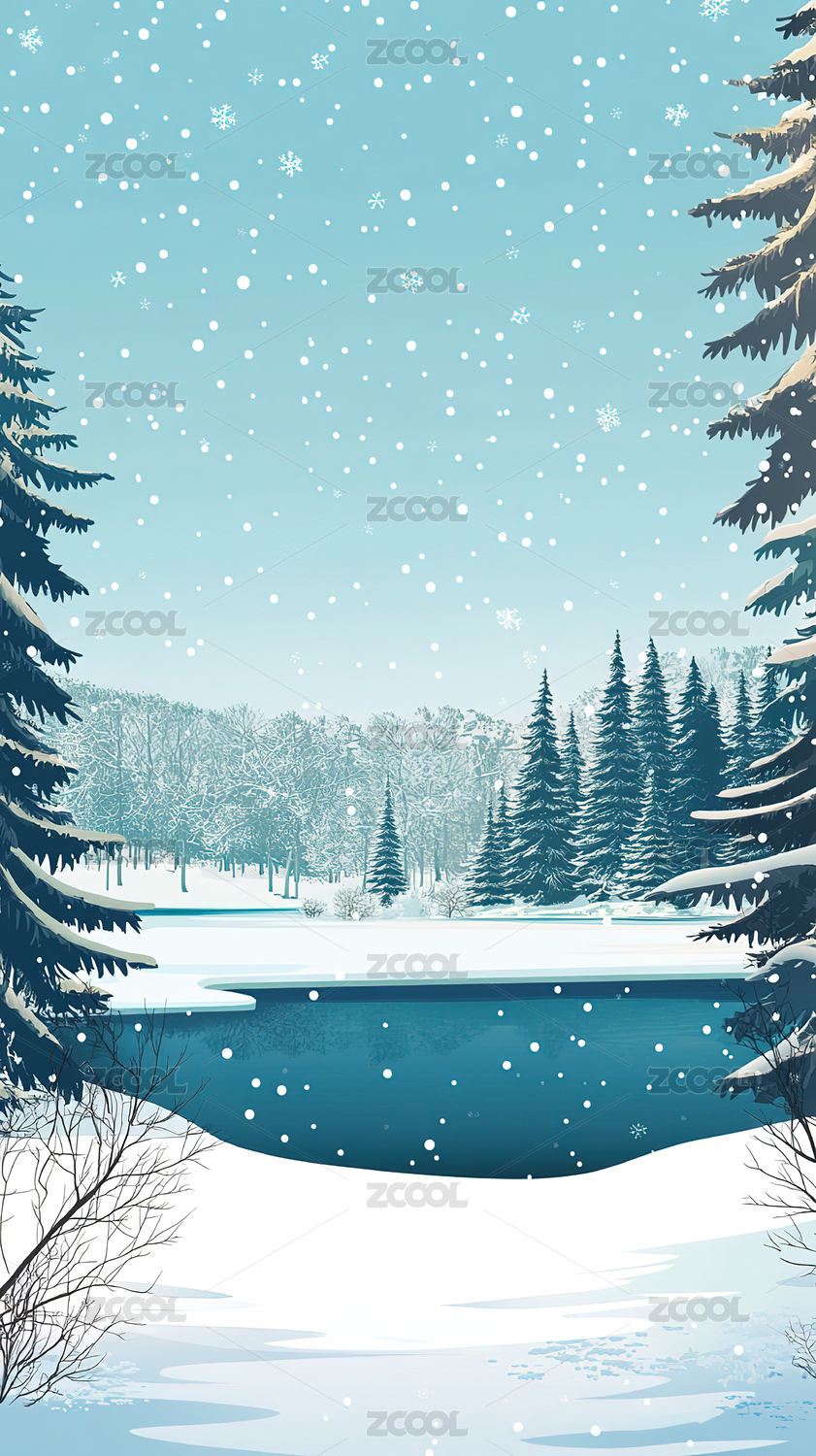 乡村雪景湖边插画海报背景