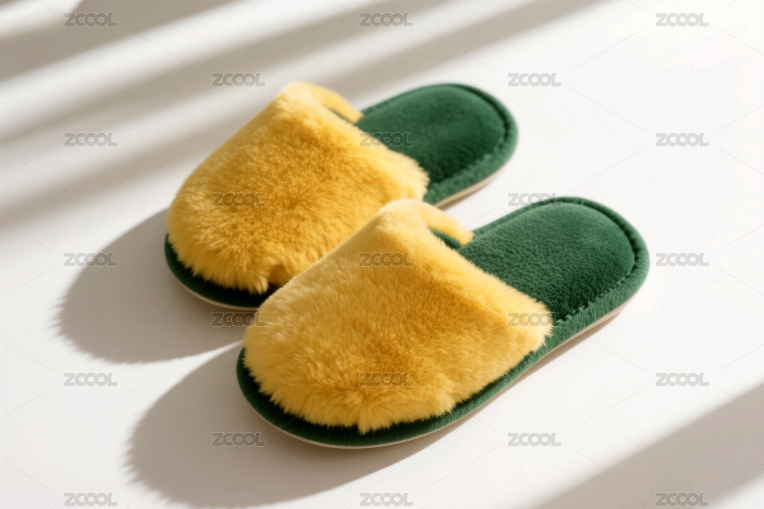 黄色背景上的一双毛绒棉拖鞋