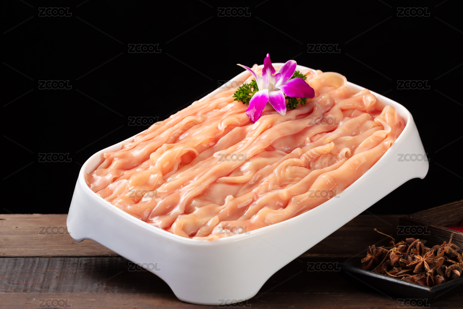 白盘里的重庆老火锅菜品鲜鸭肠鹅肠