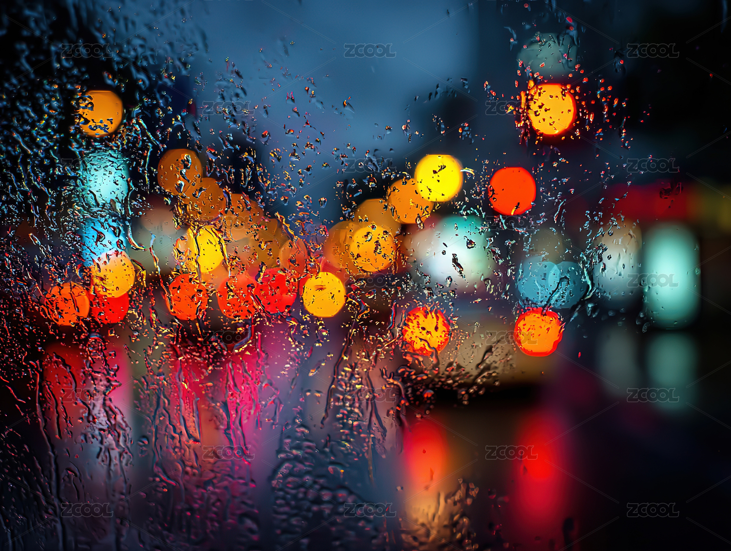 雨滴落在玻璃上,汽车尾灯形成的美丽光斑,