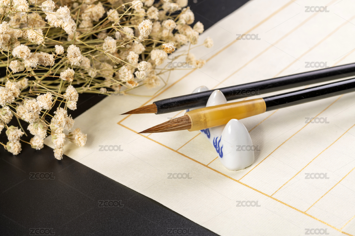 两支毛笔架在笔架上特写旁边放有宣纸