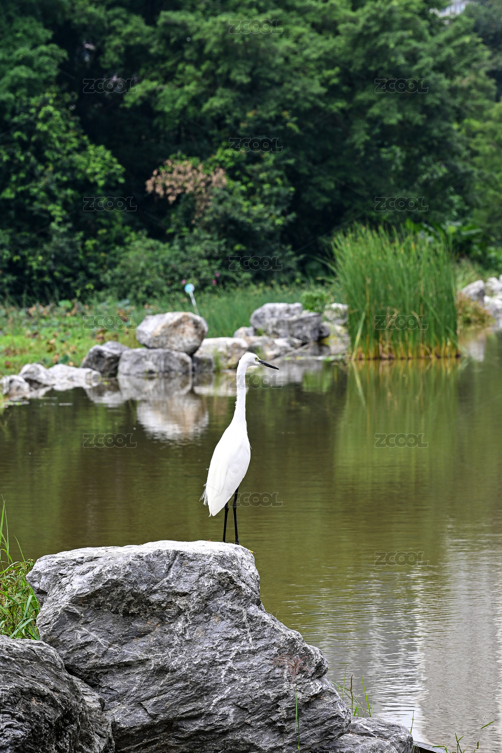 绿色树丛掩映阳光闪亮池塘中一只游泳的鸭子