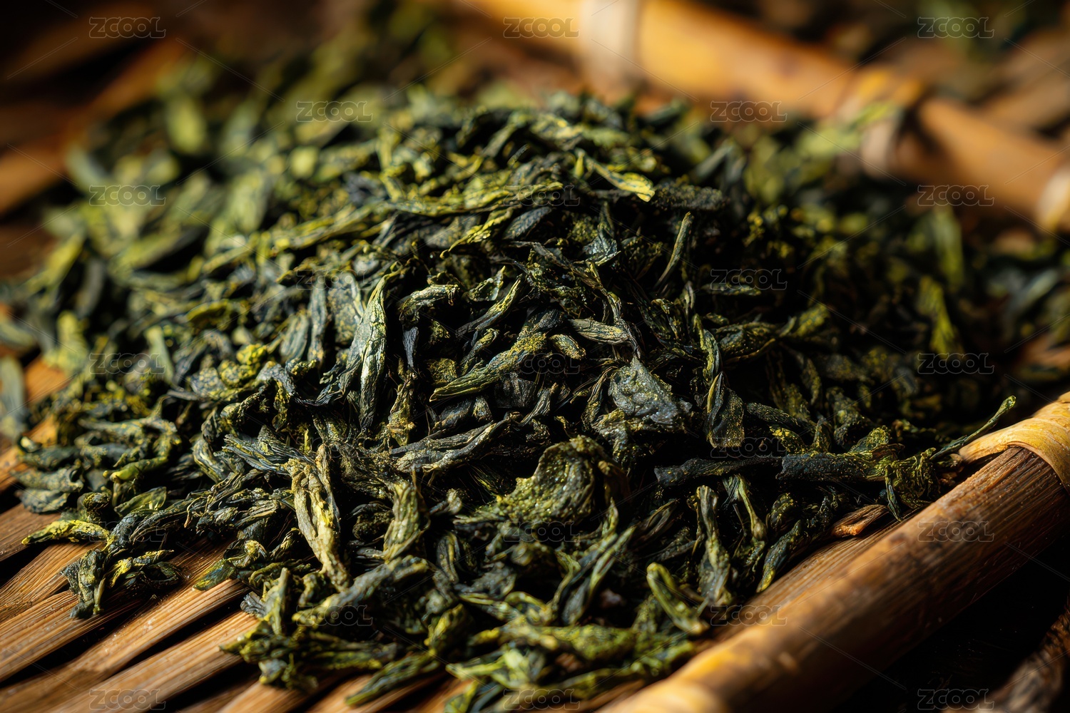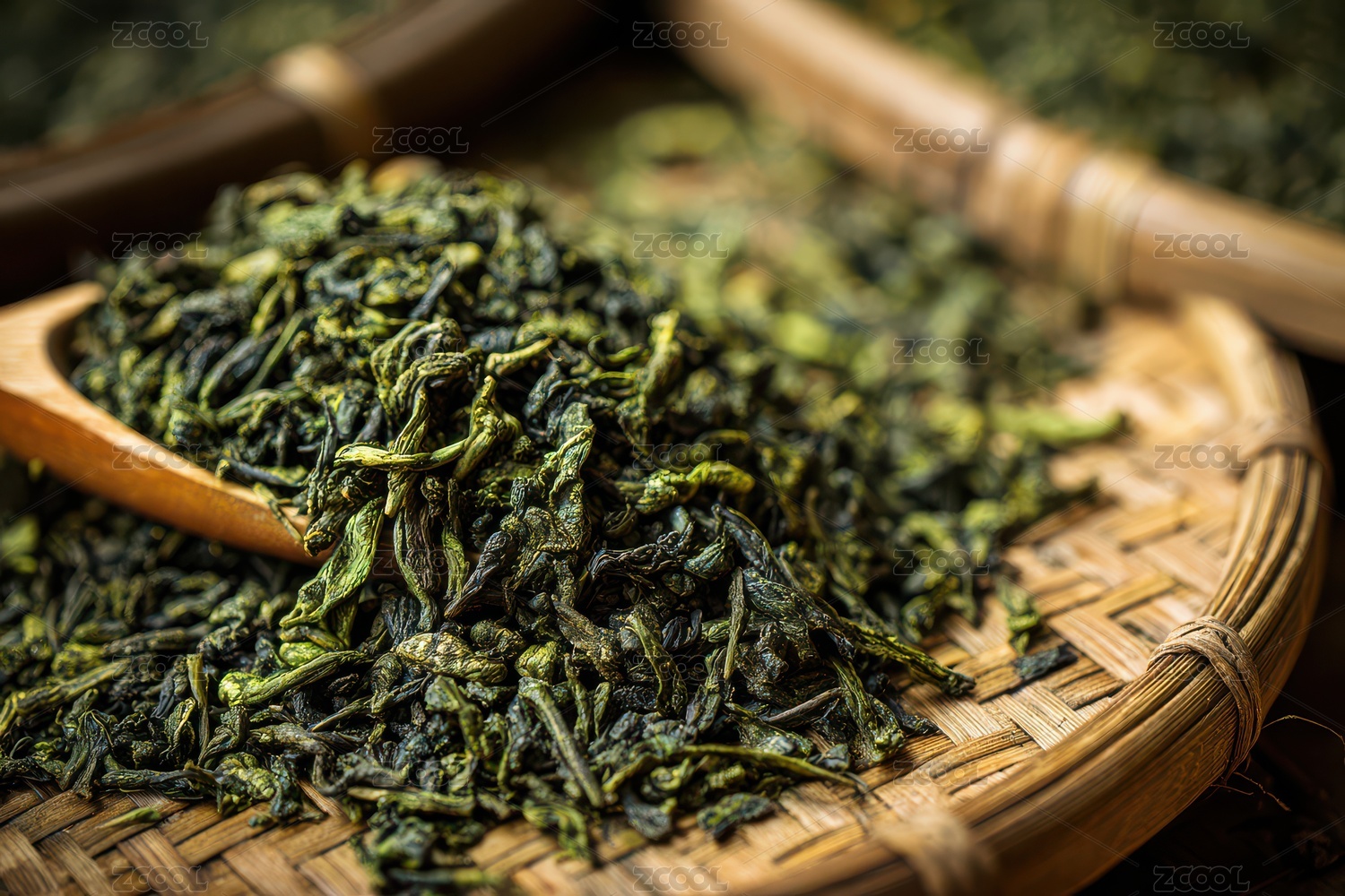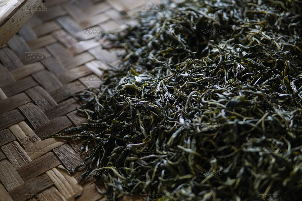 平铺在竹筐里的绿茶茶叶