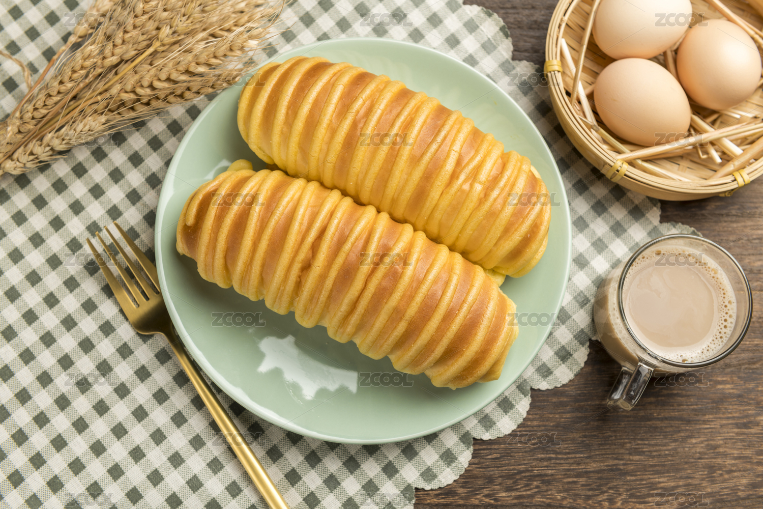 一盘鲜牛乳蛋糕卷摆放在桌面上特写
