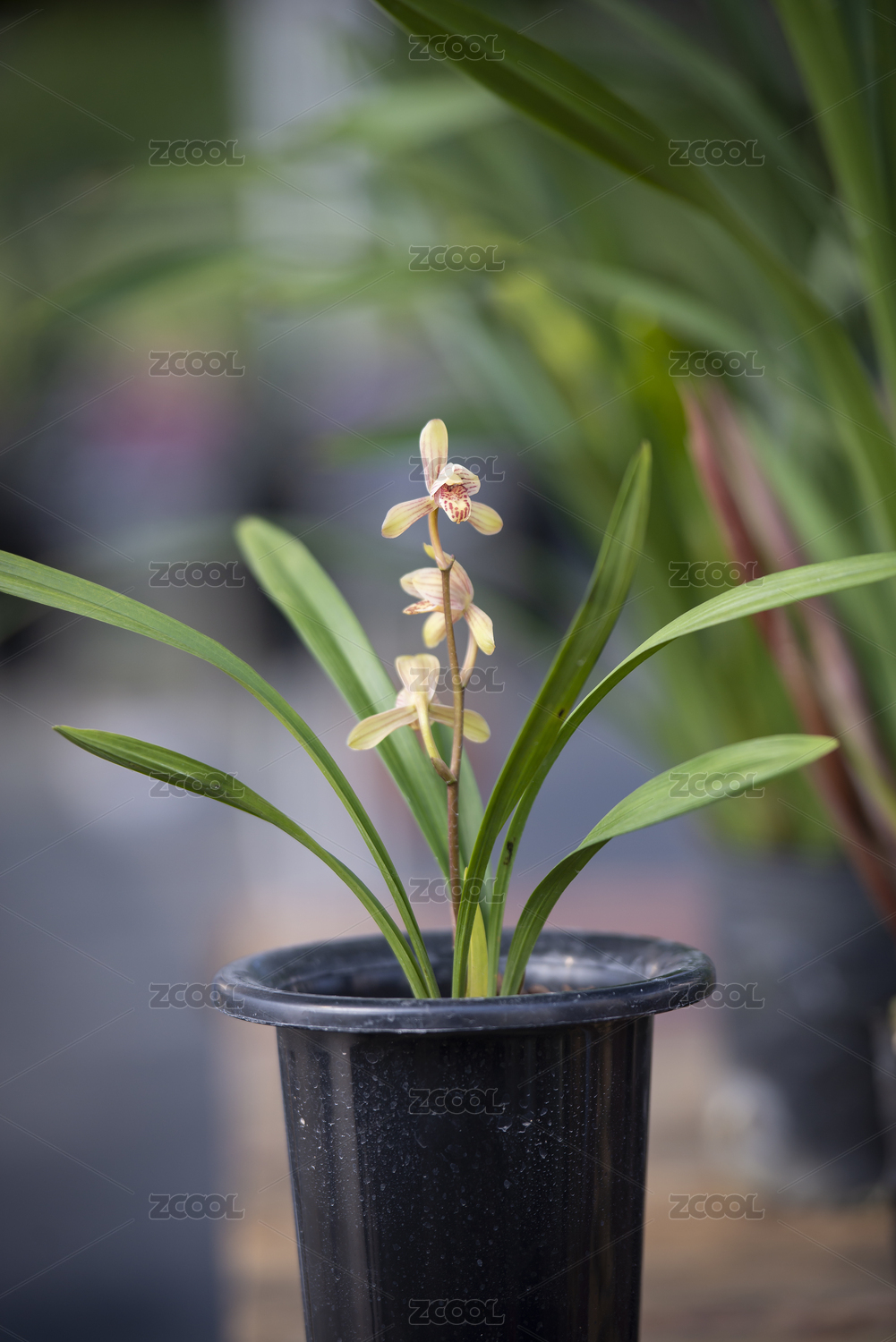 兰圃中一盆逆光下正开花的淡雅素心兰特写