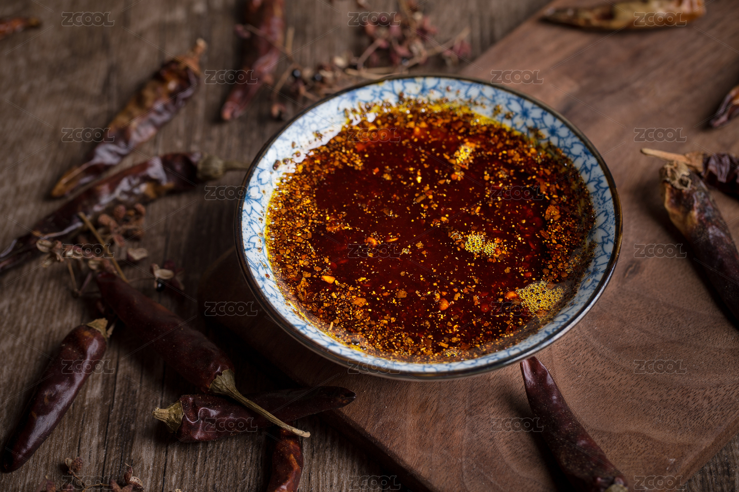 一碗纯手工制作的辣椒油和散落的红辣椒