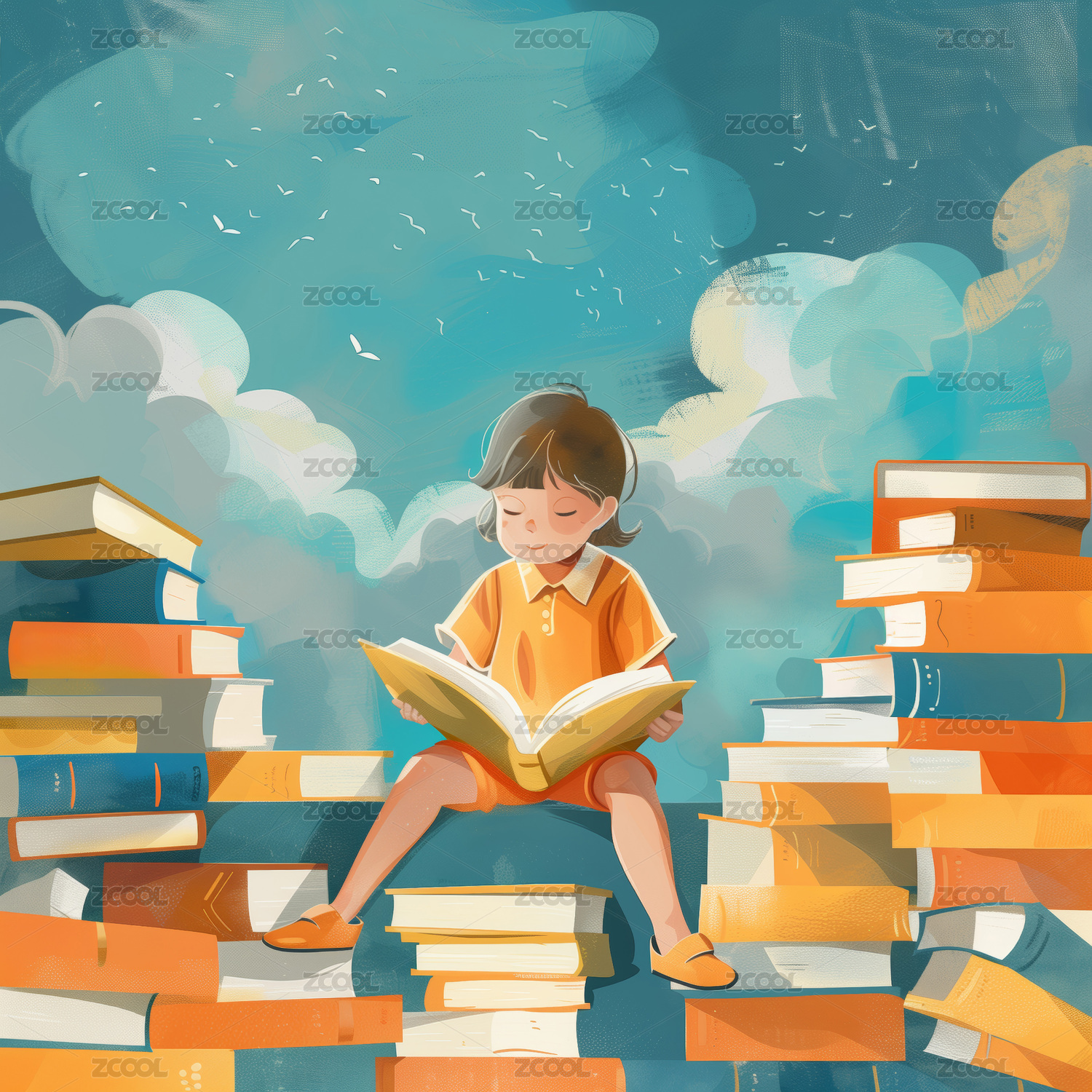 卡通男孩坐在巨大书本上阅读学习场景插画