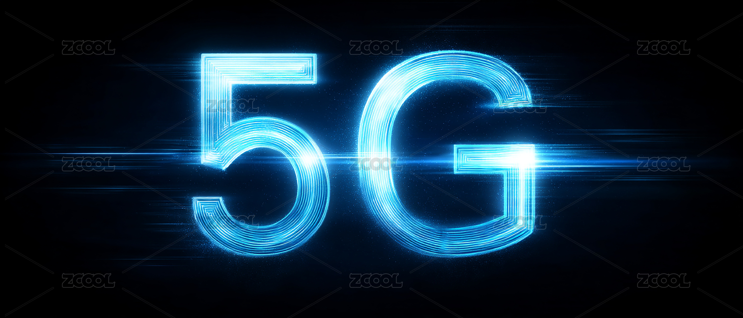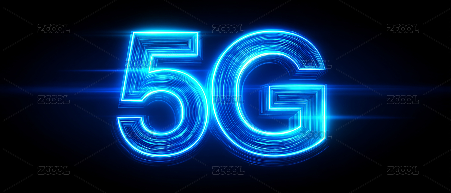 霓虹灯5G科技蓝光字样在深蓝色背景上