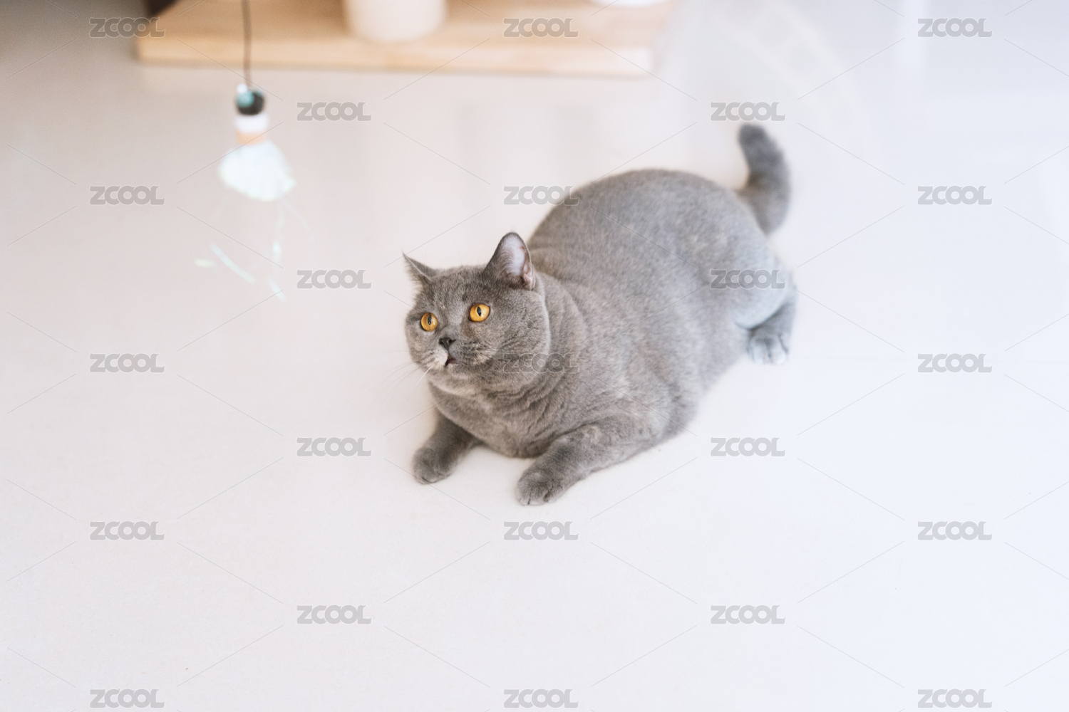 灰色的英国短毛猫蓝宠物猫好奇的玩着逗猫棒