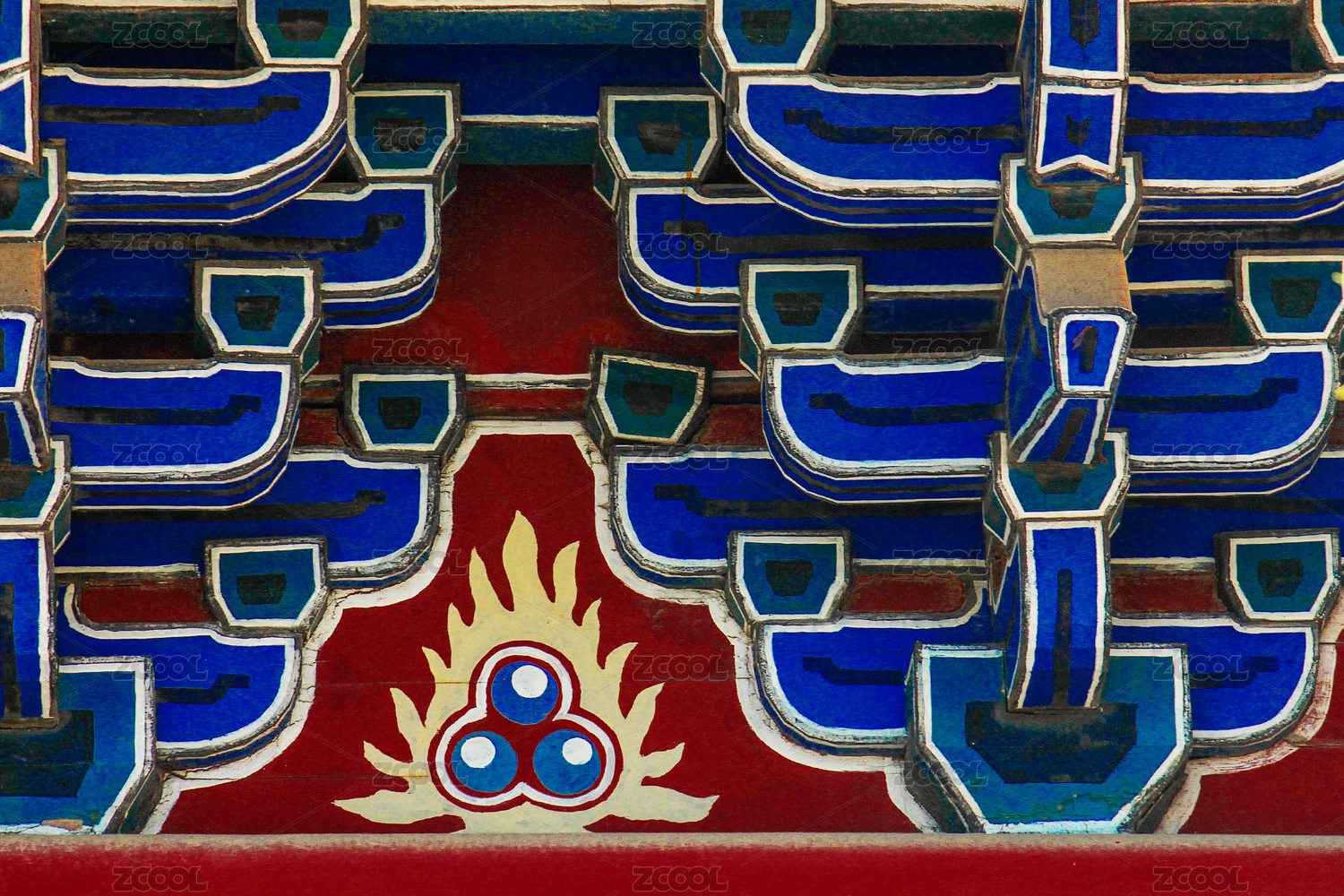 中国传统古建筑九踩斗拱及彩绘纹理图案特写