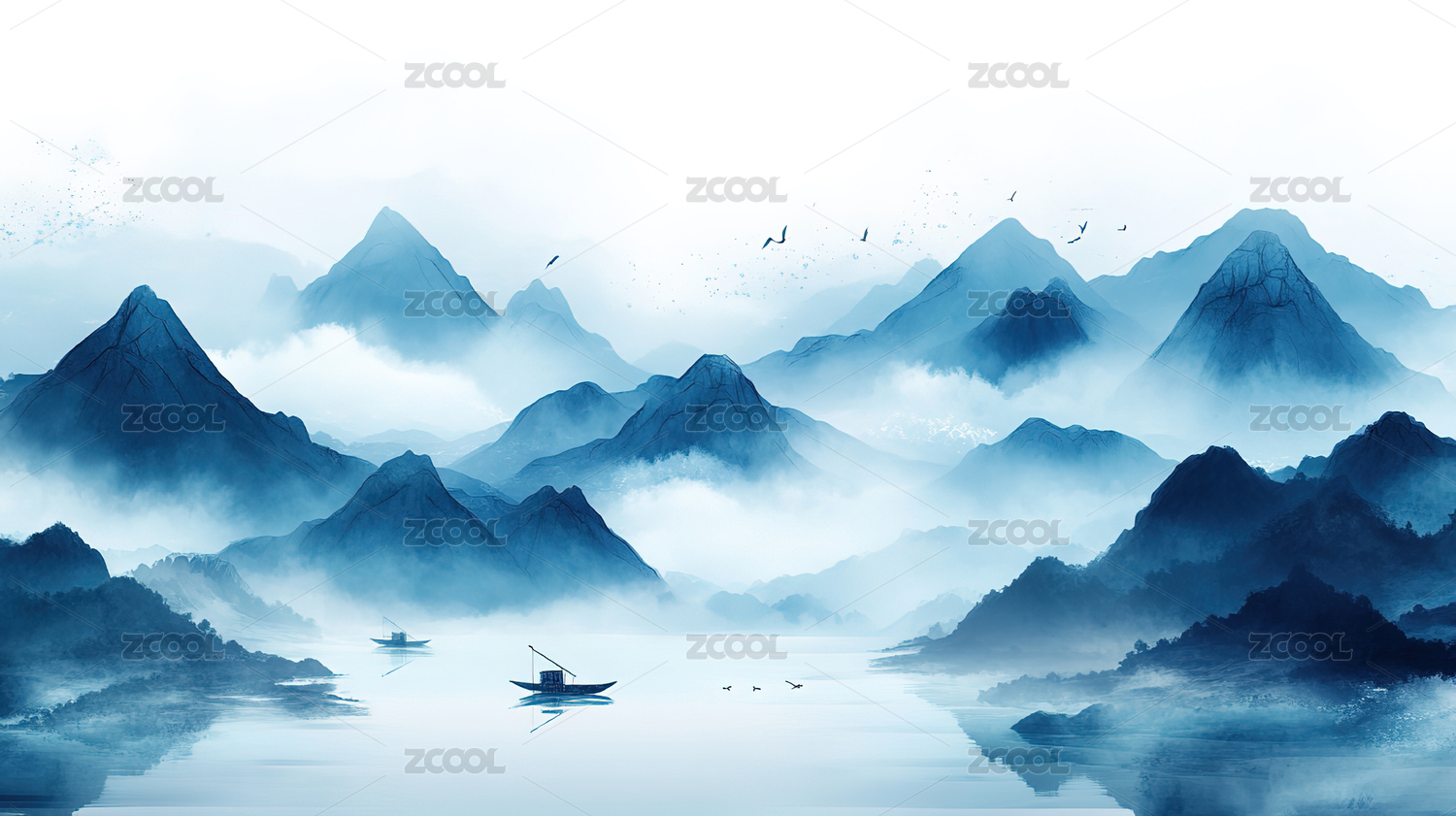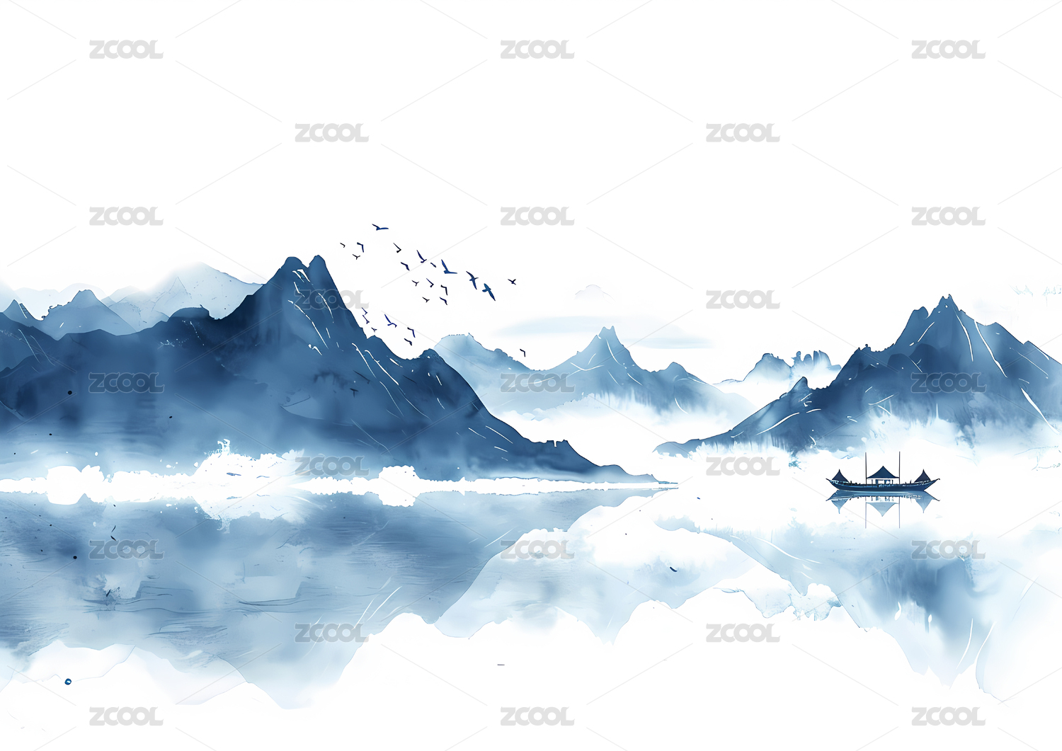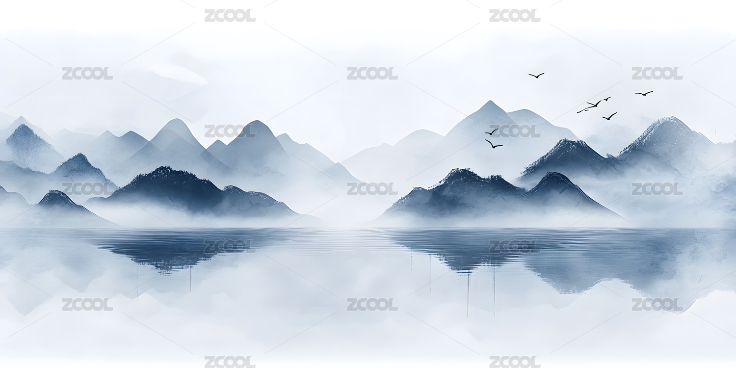 蓝色水墨意境山水画风景装饰画插画