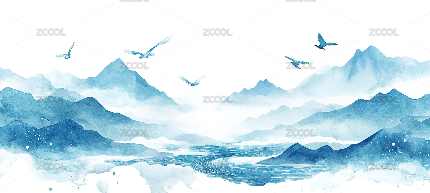 新中式蓝色水墨意境风景山水画