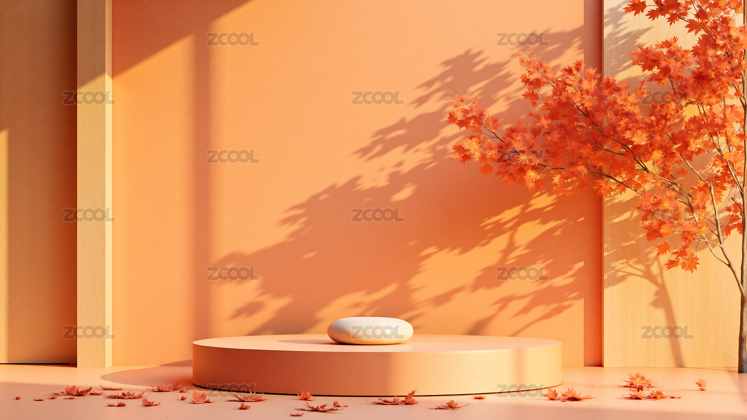 暖色调室内场景,圆形台面与枫叶装饰