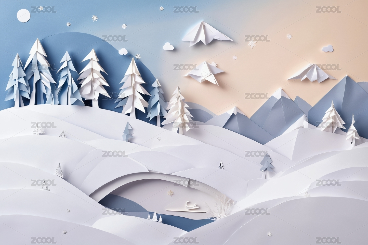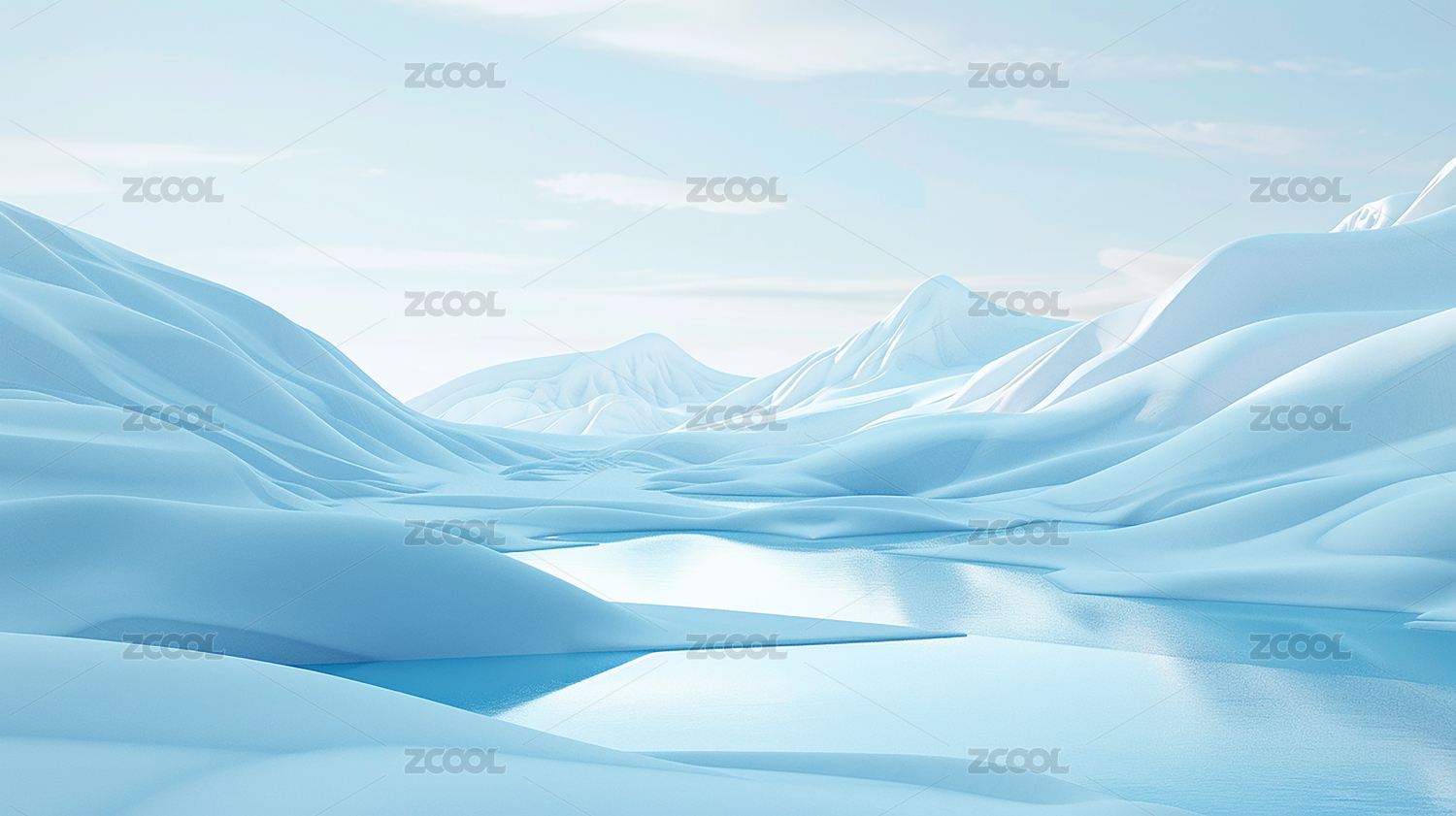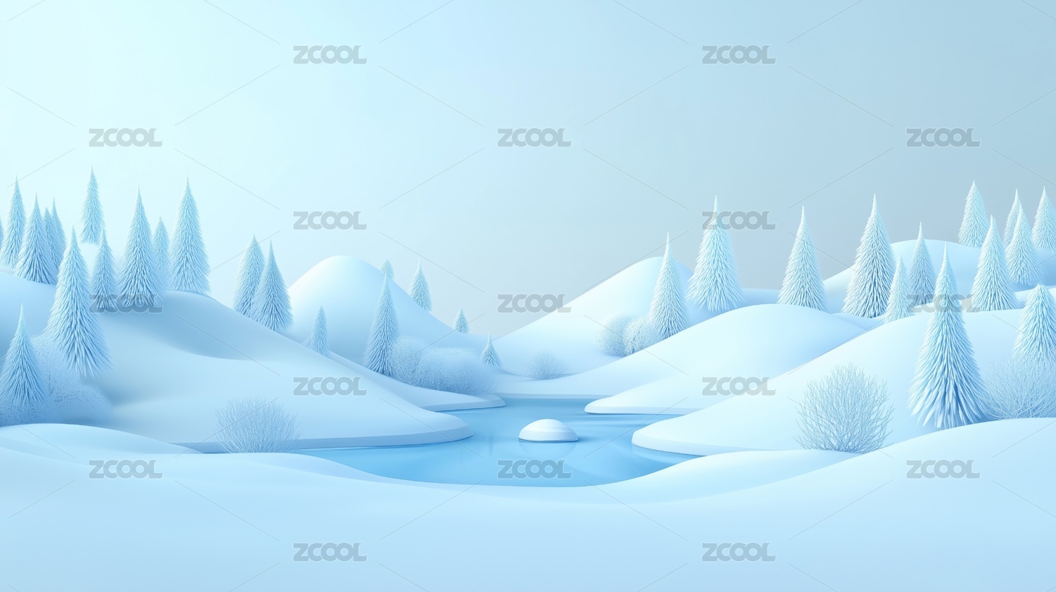 冬天清新明亮下雪的山丘河谷3D卡通背景