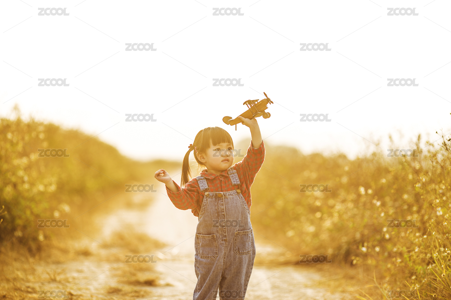 女孩子拿着模型飞机在田野玩耍