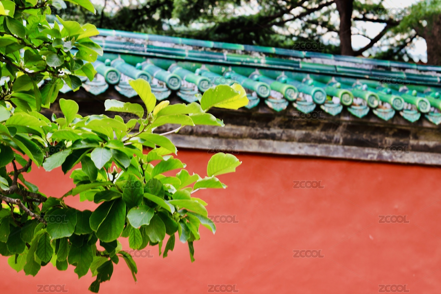 冬日温暖的阳光照在中国古典建筑的屋顶和树叶上