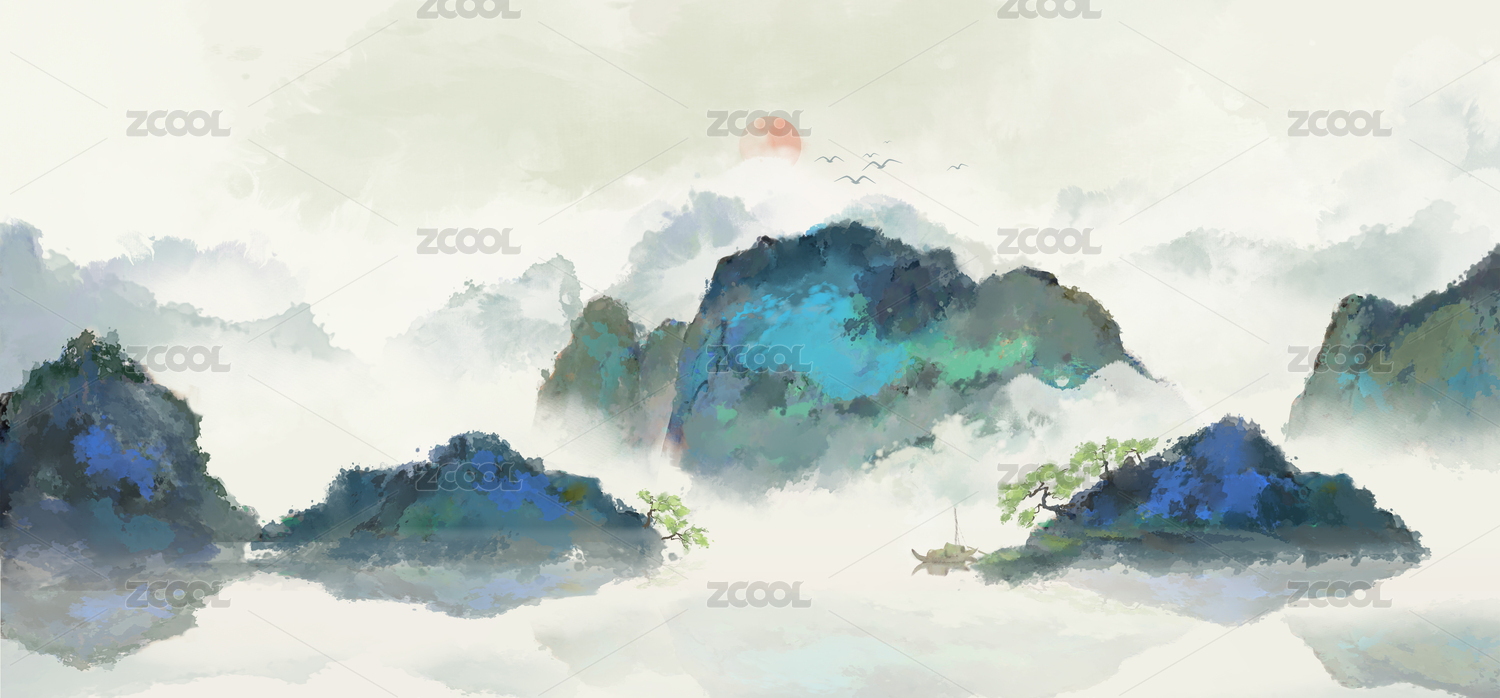手绘国潮风千里江山图 水墨泼墨泼彩山水画