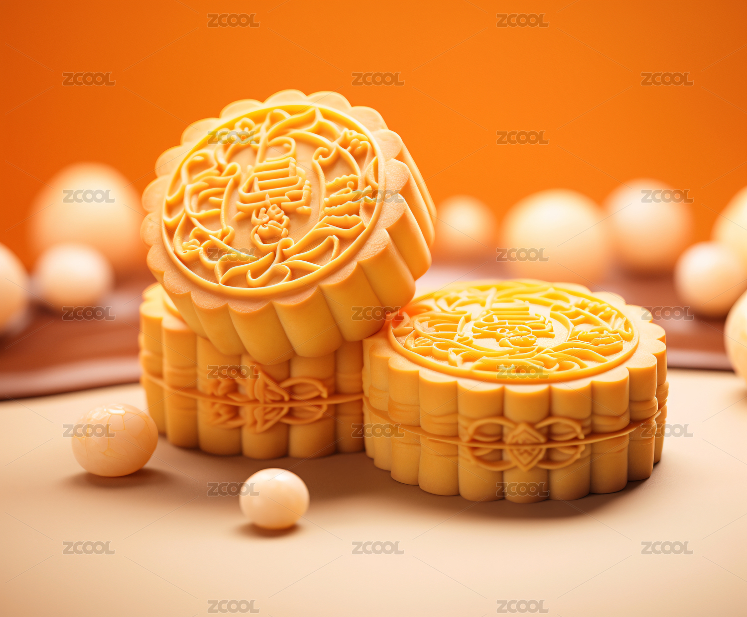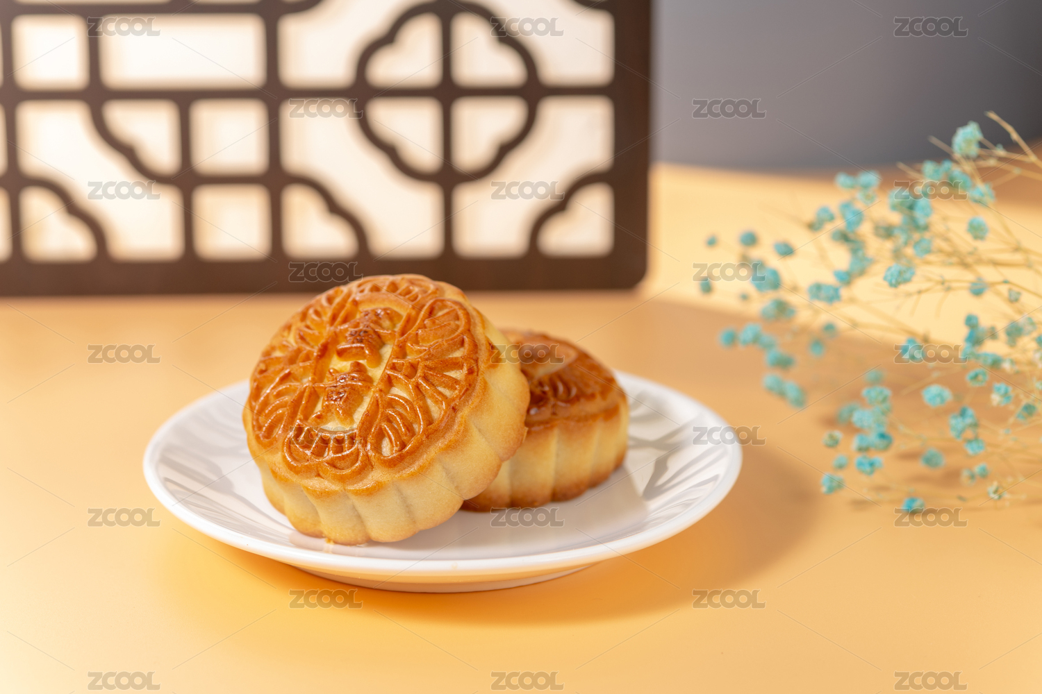 中秋节美食月饼摆放在古窗棂的暖色背景上