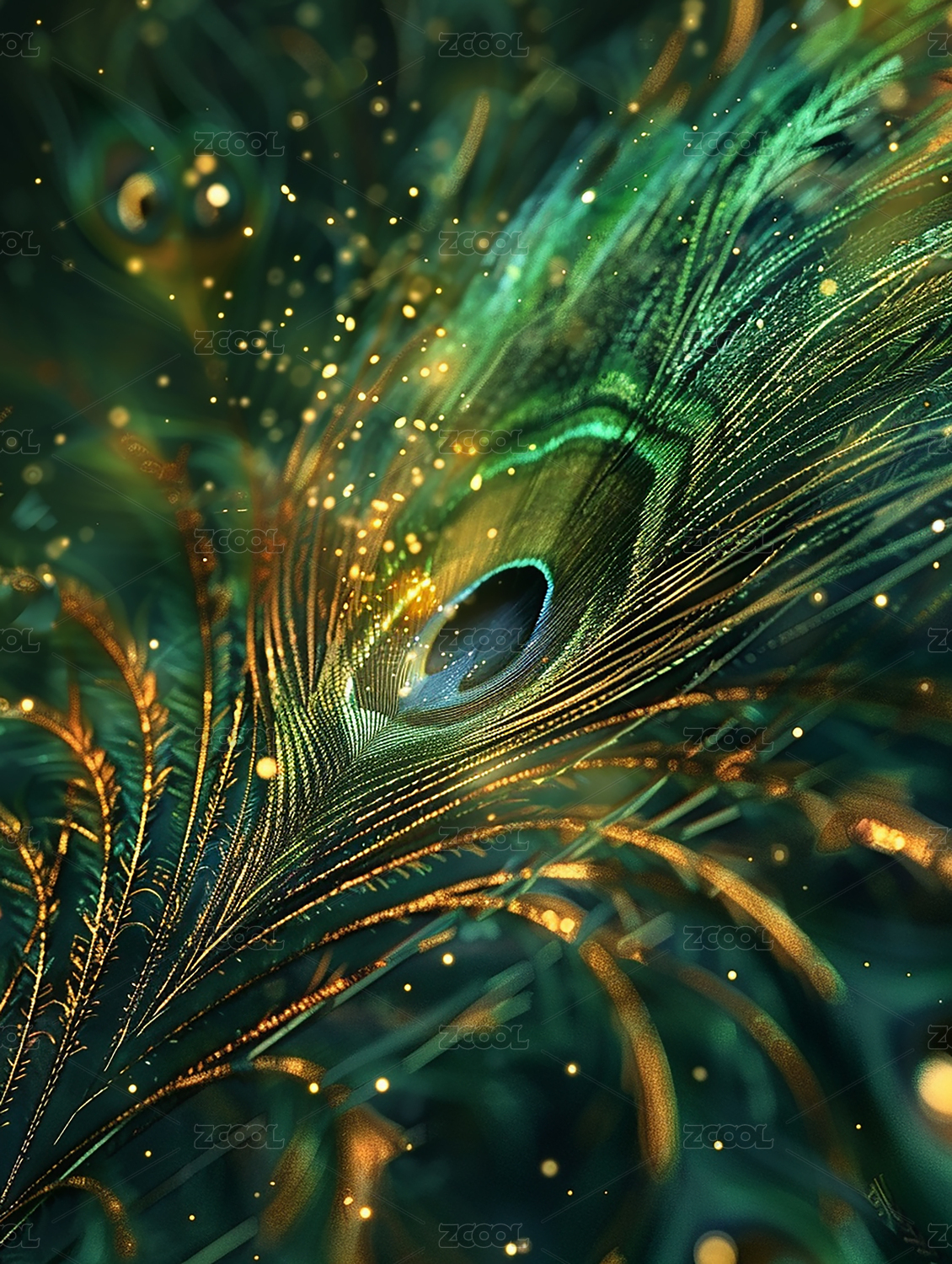 金色光芒下的孔雀羽毛特写