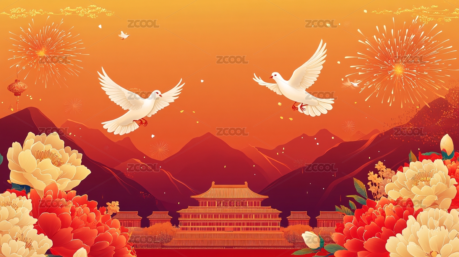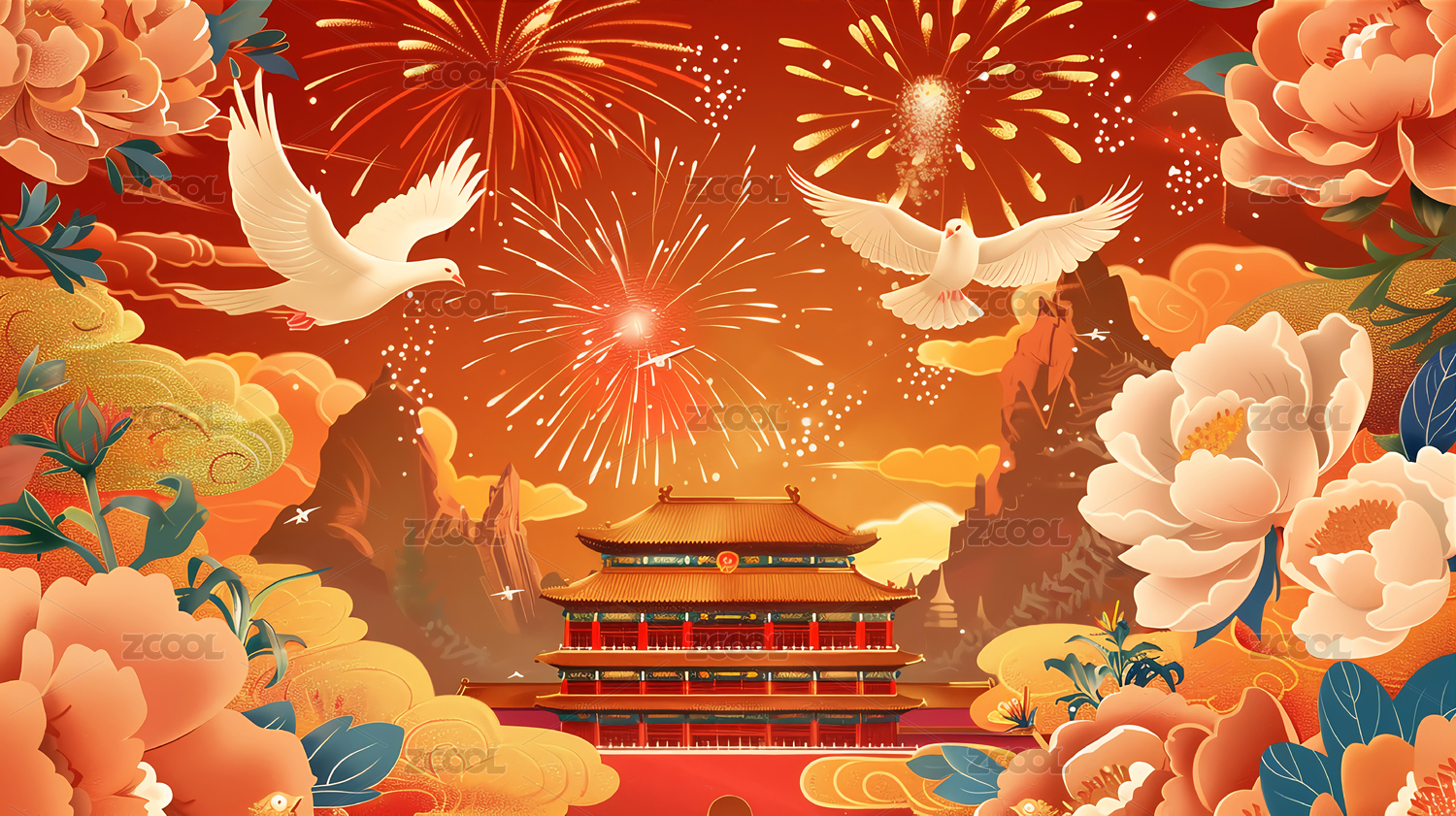 背景,插画,国庆,国庆节,红色,金色,白鸽,鸽子,古建筑,故宫