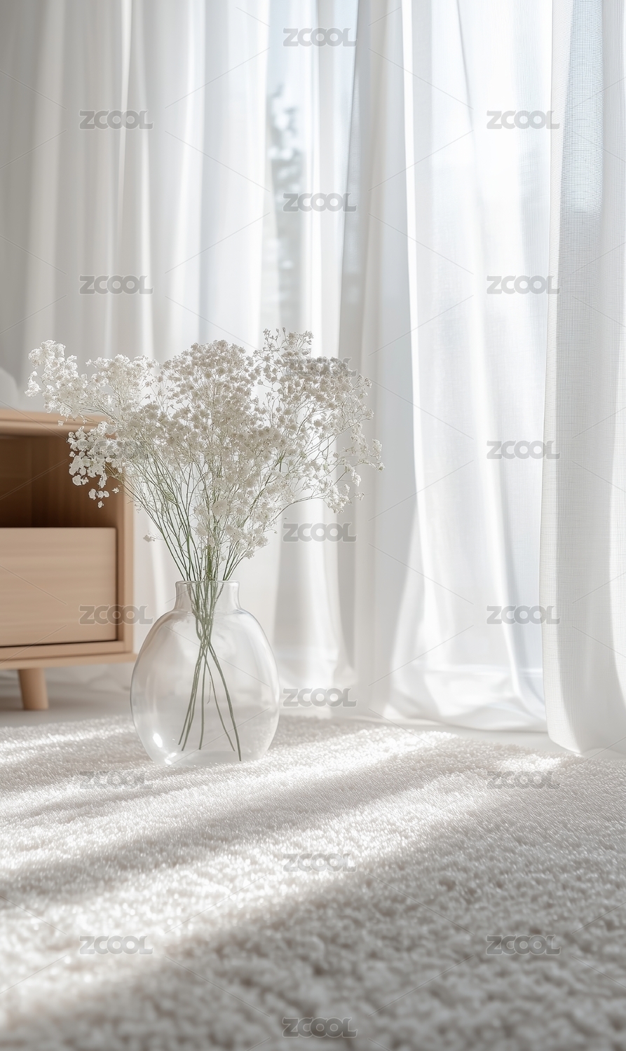 清晨阳光透过窗纱洒在花瓶上的宁静光影