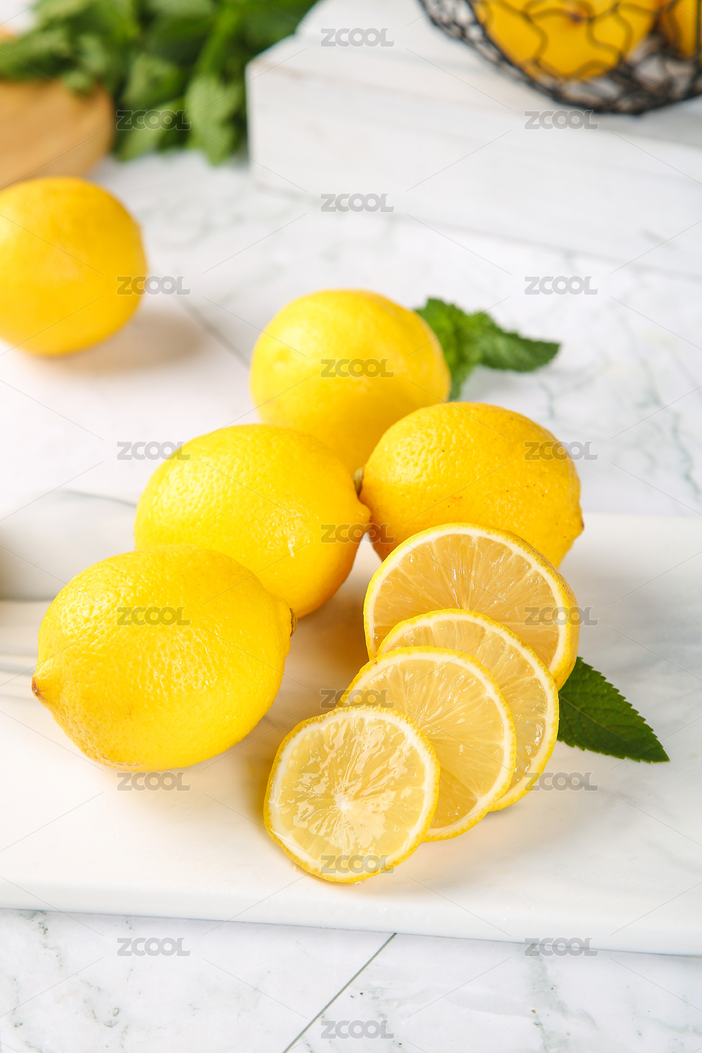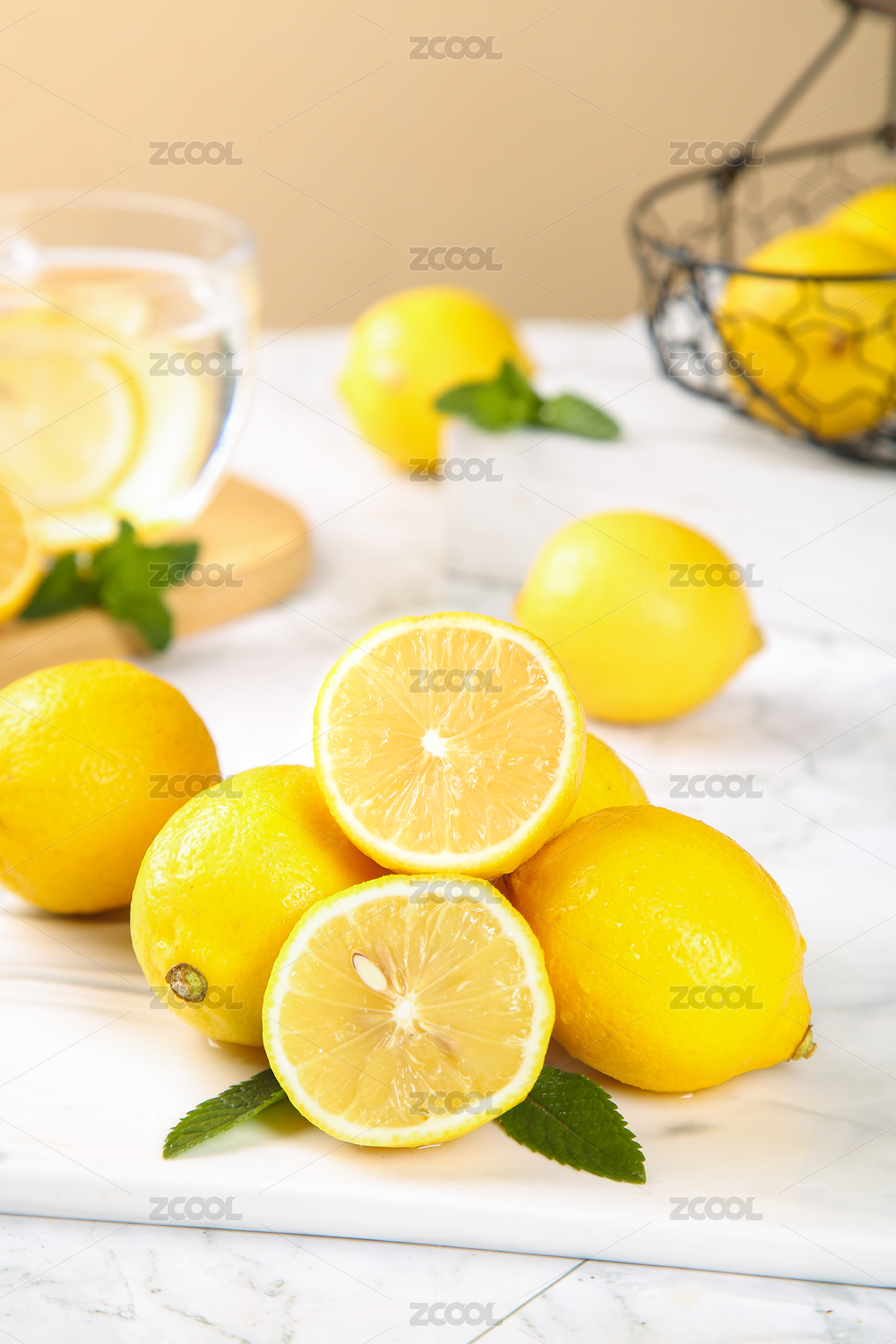 大理石纹背景里的一盘柠檬