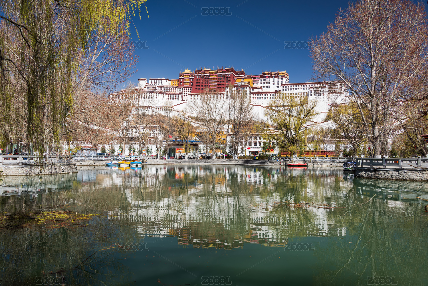 西藏拉萨布达拉宫古建筑与城市公园湖泊