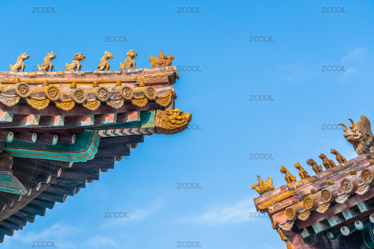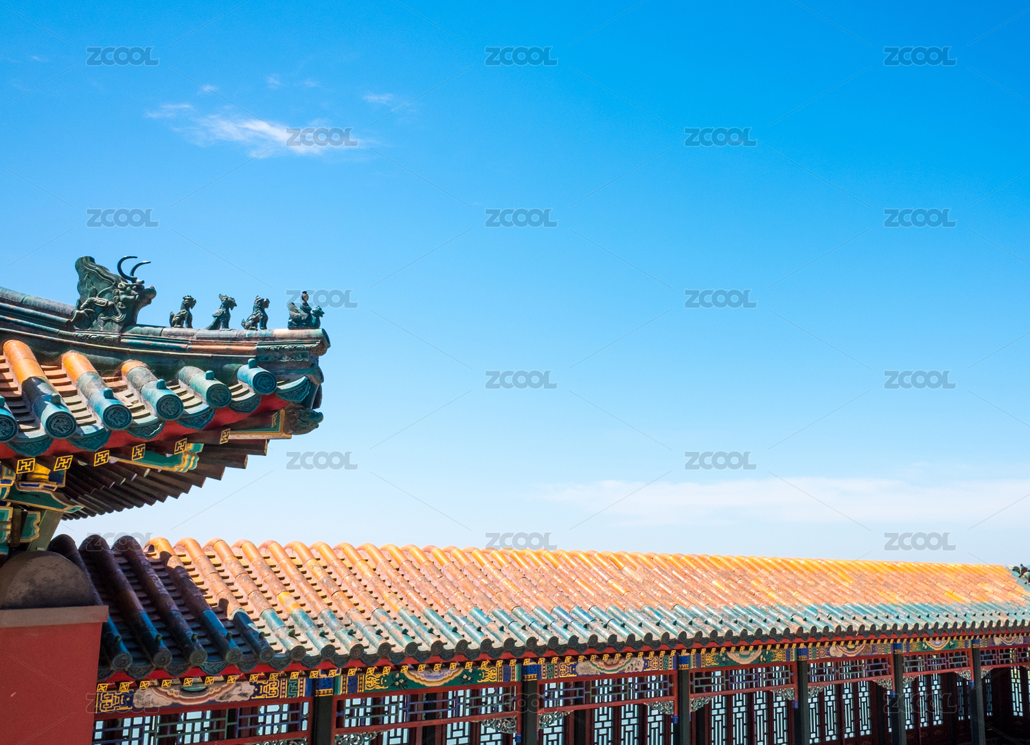 蓝天下的北京中山公园宰牲亭屋顶房檐特写